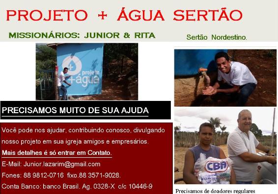 Júnior & Rita Lazarim PROJETO + ÁGUA SERTÃO ... Miss Junior & Rita ... levamos a palavra de Deus ao Sertão Nordestino e usamos este projeto para poder servir esses irmãos , pois a água é sua maior necessidade , já implantamos dois dessalinadores no Piauí , somos mantidos por doações e precisamos de doadores regulares , precisamos muito de sua ajuda 04/06/2016 - Bom dia meus amigos. A Paz do Senhor nosso Deus. ( " Depois disto, ouvi a voz do Senhor, que dizia: A quem enviarei, e quem há de ir por nós? Disse eu: eis-me aqui, envia-me a mim.") Isaías, 06:08. Queridos, em primeiro lugar, queremos eu e minha família, agradecer as orações dos irmãos em nosso favor, e o apoio financeiro que tens nos provido todo esse tempo, com suas ofertas. Assim a nossa missão no campo missionário pode ser realizada. Todos os dias em nossas meditações diária, vocês estão presente, louvamos a Deus pela vida de todos vocês, somos muito grato a Deus, pois É Ele que nos abençoa a cada dia. Bem, nesse próximo mês de junho, estamos com agenda um pouco apertada, estamos preparando a campanha de King's Kids que vamos realizar aqui na base nos dias 03 a 15/07. esperamos ter aqui na campanha, aproximadamente 40 crianças, entre 06 a 17 anos de idade. Teremos uma semana de teórico e uma semana de prático nos evangelismo nas ruas e em apoio a algumas igrejas, cremos que será um tempo, onde as crianças e jovens poderão ter um pequeno gostinho do que é missões, estejam orando por essa campanha e pelos preparativos, pois temos muito o que fazer, além dos preparativos das aulas e lugares para evangelismo, temos que organizar as acomodações. Outro trabalho que queremos realizar ainda nesse mês de Junho, é participar do Impacto de São João em Caruaru Pe, todas as bases da JOCUM nordeste vão estar ali evangelizando, Caruru, é a segunda maior festa de São João do nordeste a primeira é Campina Grande na Paraíba, precisamos das orações dos irmãos nesse sentido, pois Caruaru fica a 430km de Juazeiro do Norte, temos os custos do impacto e o combustível, mas cremos que o Senhor irá providenciar com certeza. Orem por nossa viagem e por batalha espiritual, pois ali é muito difícil espiritualmente. Bem amigos é isso ai, estamos felizes por saber que estamos dentro da vontade de Deus e que vidas serão resgatadas durante esse trabalho, para a glória do nosso Deus todo poderoso. Quanto a camionete que sofremos o acidente, estou mandando a documentação exigida pela seguradora na segunda feira e espero receber o dinheiro em breve, ai compraremos outra, por enquanto estamos com a nossa antiga camionete. Queridos, que o Senhor os cubra com suas ricas bençãos, e suas famílias, obrigado por tudo. Um forte abraço meu da Rita e família. Deus os abençoe. Missionários: Júnior & Rita Lazarim www.juniorlazarim.blogspot.com