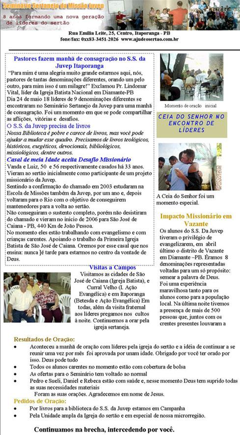 de Missões Para a Juventude EMJ Maiores informações: Escreva para a Rua Manoel Medeiros Maia, 107 Centro. Itaporanga PB CEP: 58780-000 Ou nos telefone: 0xx83- 451- 3282 CTL´S - Centro de Treinamento de Lideres no Sertão - Ministério JUVEP Ministério