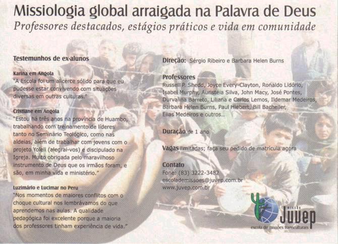 emocionais e espirituais dos obreiros que estão em campo.Estou encaminhando seu apelo já em oração pedindo ao Senhor que nossos 13º sejam uma benção para os heróis do Senhor que militam no anonimato do sertão. Deise Repasse para sua lista, por favor. obrigado Pr.pontes Data: Fri, 15 Dec 2006 Adote uma família aqui... Prezado...Leia por favor, e... Hoje pela manhã estava muito preocupado com várias famílias (inclusive 5 delas, famílias pastoral) que estão em grandes apertos financeiros...Gostaria muito de dar-lhes pelo menos um natal farto em alimentação. Para isso coloquei no meu coração levantar R $ 2.000,00 (dois mil reais) para distribuir com essas famílias. Amado. Não amemos de palavras, mas de verdade e ação. Se Envolva, me enviei uma oferta para que eu possa distribuir com essas famílias até dia 20 de Dezembro... Em nome de Jesus, envolva outros amigos e repasse esse e-mail. Envie sua contribuição... Ao enviar me escreva: Deposite : Bradesco , Ag. 435-9 Conta corrente 75 970-8 _ Jose pontes filho Boas festas e muitas vidas para o Reino em 2007. Jorge e eu desejamos a todos vocês que têm recebido de bom grado as notícias do sertão e as divulgações do Ministério Missionário Juvep, um feliz Natal e uma excelente passagem de ano para um próspero e abençoado 2007 ! Estaremos partindo para o 46º Projeto Missionário de férias no Sertão de 5 a 27 de janeiro. Esteja em sintonia conosco, orando, ofertando e enviando um representante da tua igreja. Visite nosso site www.ajudeosertao.com.br e confira as bênçãos recebidas durante o ano. Informações sobre o projeto projetomissionario@juvep.com.br e pelos telefones (83) 3222-3482 - 3222-4430. Boas Festas na companhia da família e dos irmãos! Um forte abraço no amor e na paz do Senhor Jesus! Jorge e Deise Machado Conheça o Radical Sertão e envolva-se, pois temos como Igreja brasileira o desafio de alcançar o povo sertanejo. Nesse projeto não precisamos de passaporte, conhecer idiomas ou dialetos altos custos com passagens e manutenção mensal, pois esse povo ainda não alcançado está aqui dentro do nosso país. Temos ainda entre os 12 milhões de sertanejos das zonas rurais menos crentes que em muitos países muçulmanos, 0,1%. Se o folder virtual com as informações não abrir no teu e-mail, me retorne e te enviarei em anexo, pois é muito importante que você e tua igreja entrem em sintonia com esse desafio e participem dessa missão. (12/12/06)