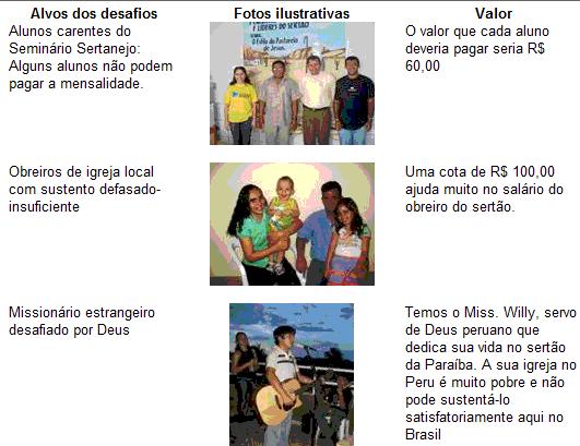 Estado, João Pessoa. Este primeiro Projeto tinha como objetivo plantar uma igreja e foi realizado com uma equipe de quinze jovens por dez dias. Após esta experiência, amadurecidos com a análise do trabalho, percebemos a grande necessidade do interior nordestino, cujas cidades vivem sob uma carência espiritual deprimente, resultado da pouca ou nenhuma assistência espiritual que recebiam à época. Orientados por Deus realizamos uma exaustiva pesquisa envolvendo todo o Estado da Paraíba no objetivo de levantar o seu perfil religioso. Detectamos, então, o que procurávamos: as cidades mais carentes do evangelho e, principalmente, aquelas desprovidas de qualquer trabalho evangélico. Encontramos desta forma, as cidades sem evangelho em todo o estado da Paraíba, que estavam à nossa espera, sendo que a maioria absoluta situava-se no sertão, região mais pobre e idólatra. Nasceram a partir daí, os Projetos Missionários atuais, direcionados às cidades sem evangelho com o objetivo de alcançar populações ainda não alcançadas para abertura de campos missionários e, conseqüentemente, de igrejas pioneiras. "Para não edificar sobre fundamento alheio; antes, como está escrito: Hão de vê-lo aqueles que não tiveram notícia dEle, e compreendê-Lo os que nada tinham ouvido a Seu respeito", Romanos 15: 20,21. Uma característica dos Projetos Missionários é a mobilização de diversas igrejas evangélicas do Brasil para apoiar de forma concreta os citados Projetos, movidos pela visão missionária de alcançar e abençoar uma cidade sertaneja com o Evangelho de Cristo. Forma-se, portanto, uma grande frente evangelística da qual participam igrejas das mais diferentes denominações que dão apoio e retaguarda no envio das Equipes Missionárias, formadas por voluntários vindos de várias partes do país. Portanto, é permanente o nosso sentimento de gratidão a Deus pela vida da liderança pastoral do nosso país. I