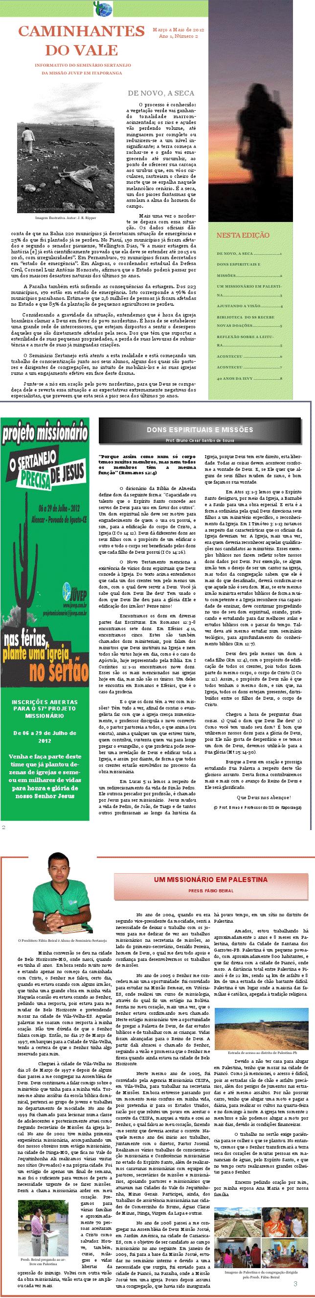 do Projeto Missionário 26/05/2012 - Queridos Irmãos, Deus tem sido maravilhoso para conosco aqui, no Seminário Sertanejo. Assim, compartilhamos com vocês as bênçãos dEle sobre o nosso querido SS. Vocês podem constatar isto no nosso Informativo Caminhantes do Vale, número 2, que segue em anexo. Grande abraço a todos e continuem orando por nós, pois esta obra não acontece sem desafios e oposições do nosso adversário. Precisamos de cada um de vocês. Em Cristo, Alexandre Azevedo. Jesus andou