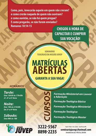 possui Inscrição Gratuita. Você é o nosso convidado especial, compareça. <>< <>< <>< <>< <>< <>< <>< <>< Missão Juvep Evangelizando os sertões e nações 55.83.3248-2095 _ juvep@juvep.com.br Receba