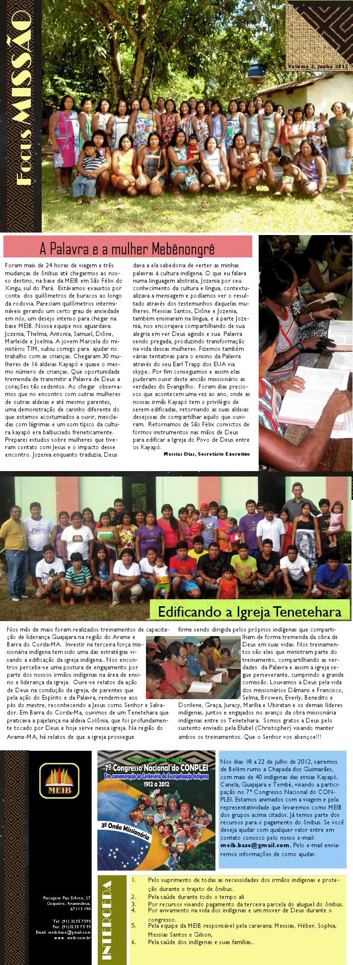 buscado mudar a realidade espiritual das tribos indígenas através do ensino da Palavra de Deus, tradução das Escrituras, estabelecimento de igrejas autóctones e capacitação de liderança indígena. Das 340 etnias existentes no Brasil, a MEIB está presente em apenas 4 grupos: Kayapó, Canela, Guajajara e Tembé e conta com 22 missionários cedidos e mantidos parcialmente por suas igre- jas. Hoje nosso foco concentra-se na capacitação de liderança indígena, entendendo que os indíge- nas devem tanto como nós cumprir a Grande Comissão, sendo canais do amor de Deus em suas próprias etnias, bem como, em outros grupos que ainda não foram alcançados pelos boas novas do Evangelho. A seara indígena é grande e os trabalhadores são poucos... capacitar liderança indígena é estratégico para alcançar as demais etnias, pois os mesmos possuem habilidades naturais, como o conhecimento da cultura, o domínio da língua e o fato de serem indígenas. Apesar da fiscalização federal ser adotada para ambos, os indígenas poderão ter menos restrições para entrar em outras etnias visando o trabalho missionário. A estatística coordenada pelo DAI (Departamento de Assun- tos Indígenas da AMTB), identificou 111 grupos urbanizados. São indígenas que migraram para cidade em busca de educação, saúde e outras necessidades. A maioria deles pelo senso vivem co- mo mendigos, dependentes do branco para se manterem. Essa realidade pode ser revertida pela igreja com ações de alcance a esses grupos, oportunizando aos mesmos o retorno a aldeia ou ações que visam minimizar o impacto da vida na cidade. Em novembro de 2010, entregamos para a igre- ja indígena 8 alunos que receberam treinamento durante 16 meses para serem canais visando a edificação da igreja indígena. Somos gratos a todas as igrejas que tem contribuído para que os ir- mãos indígenas sejam devidamente preparados. A igreja indígena ainda necessita depender dos recursos de irmãos e igrejas para manter seus líderes até que essa igreja se torne auto-sustentável, auto-governável e que se auto-propague. Temos ainda um longo caminho pela frente e precisamos caminhar JUNTOS. Deus tem ouvido as orações em favor dessa obra, e temos plena certeza que essa intervenção é fruto das intercessões dos santos e dos recursos enviados e destinados para sus- tento dos missionários e sustento de líderes indígenas em treinamento no CTBCH. Temos como igreja e agência escrito a história da evangelização indígena para que no dia do Senhor Jesus, po- vos, línguas e nações estejam diante do Cordeiro, declarando honras e glórias aquele que é digno de todo louvor e toda a adoração. Pr. Messias Dias,