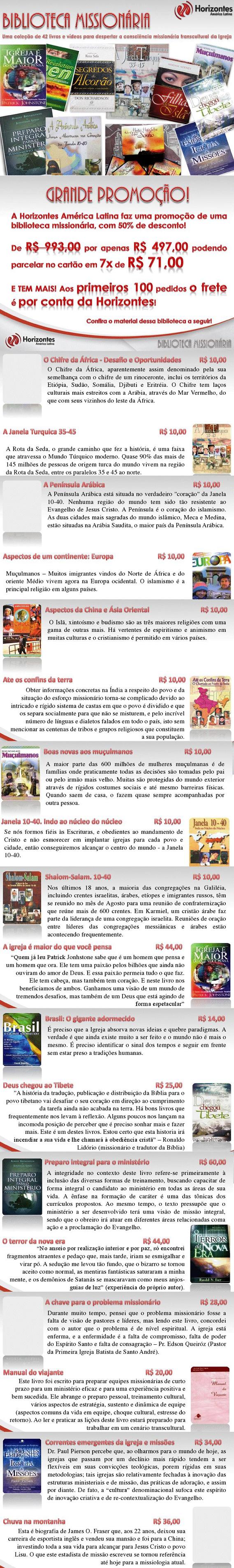 ORAÇÃO: 27/01/2014 - Oração por um avivamento missionário No ano de 1992 morávamos no País de Gales e estávamos ali para aperfeiçoar na área de treinamento, mobilização e estratégia de conscientização, recrutamento, envio de obreiros e cuidado missionário. Foi um milagre chegar ali, devido os custos para uma família de cinco membros morar na Europa naquela época. Uma irmã de Bebedouro havia programado uma viagem para Israel e a cancelou para doar os recursos para nossas passagens. Conseguimos uma casa gratuita onde 30 missionários britânicos se uniram para pagar o aluguel, pois estávamos ali para aprender sobre liderança transcultural com o objetivo de voltar ao Brasil para estabelecer o CENTRO PARA AS NAÇÕES. Compartilhamos a visão com a família Grinberg, Verner e Emília, que doaram o terreno de 30.000 m2 da base em Monte Verde. Irmã Emília nos confidenciou no culto de consagração da primeira casa, em 1995, quando o Dr. Russel Shedd estava pregando, que o Senhor havia dado uma visão a ela, quarenta anos atrás, que deste lugar sairiam vidas que brilhariam nas nações e isto tem se cumprido, pois um terço da força missionária brasileira na Janela 10-40 tem passado por um dos treinamentos. Ao compartilhar com o líder de intercessão da base britânica sobre o grande desafio no envio de obreiros, a partir do Brasil, pois em 1991 havíamos tido uma inflação de 1158% e o salário mínimo era em torno de 75 dólares e mais de 75% da população recebia menos de dois salários mínimos e a necessidade de sustento mensal de um obreiro transcultural na Janela 10-40 era de 12 salários mínimos. Estas informações nos impulsionaram a levantar um movimento de intercessão pelo Brasil, igreja brasileira e por obreiros. Reuníamos as cinco da manhã e no inverno era um grande desafio sair de casa. No grupo de intercessão havia ingleses, galeses, outras nacionalidades e a gente orando pelos desafios missionários brasileiros. O tempo passa e o quadro financeiro da população brasileira é revertido para melhor, pois em menos de 10 anos o salário mínimo aumenta quatro vezes, em dólares, e o Brasil passa a ser uma das maiores economias do mundo, a igreja brasileira cresce astronomicamente e se torna popular ser gospel. Os desafios dos povos não alcançados se tornam conhecidos em nossa pátria, o artigo Janela 10-40 é produzido e promovido nacionalmente pela Horizontes, mas infelizmente a paixão e compaixão pelos perdidos entre os povos não alcançados diminuiu assustadoramente. A nossa realidade atual é de que nos últimos dez anos nós nos aperfeiçoamos em estratégias, melhoramos em aproveitar as oportunidades e ultimamente entramos na região do sudeste asiático onde se encontra o maior país muçulmano do mundo, estamos envolvidos com a tarefa de alcançar o país de maior perseguição religiosa e no projeto de formar tradutores da Palavra de Deus, mas os obreiros tem diminuído e os recursos financeiros tem escasseado. Se tivéssemos um avivamento missionário estaríamos contentes, mas vemos que a média de investimento do cristão brasileiro em missões transculturais anualmente é menos correspondente ao valor de uma Coca Cola. Como podemos dizer que amamos missões se não investimos na obra missionária? A Horizontes tem o terceiro maior museu da Coca Cola do Brasil e ali está escrito a famosa frase de que o evangélico brasileiro gasta mais com coca cola do que com missões. Há mais de dois mil itens de mais de 120 países. Se cada crente investir, mensalmente, somente o valor de R$ 10,00 em missões transculturais poderemos multiplicar a força missionária em cem vezes. Estamos buscando representantes nas igrejas que organizem grupos de crentes que invistam R$ 10.00 mensais e os que conseguirem no mínimo 13 e ao final de 10 meses receberá uma biblioteca missionária no valor de R$ 1.300.00 , além de que terá uma gratuidade no Congresso do Mobilizador em Monte Verde. O primeiro será nos dias 14 a 16 de março. Você pode ajudar a divulgar este projeto da biblioteca para irmãos e pastores? Os que se interessarem podem escrever para (materiais@mhorizontes.org.br) Cremos que