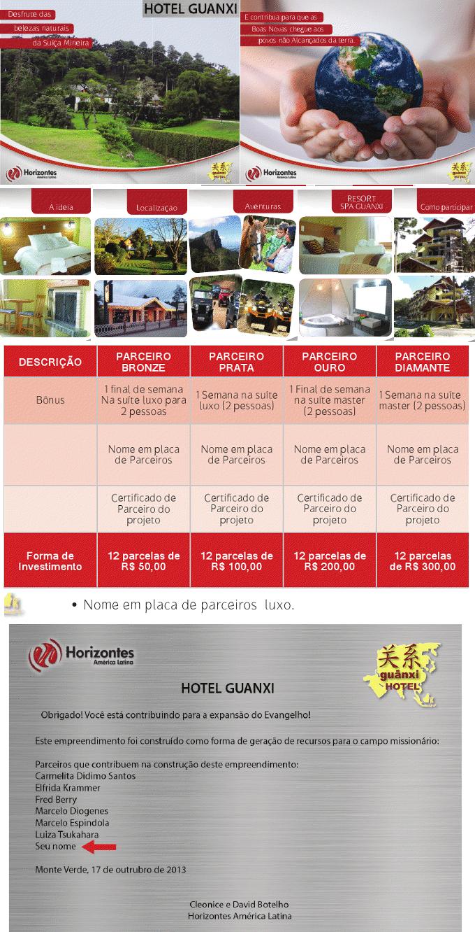 força de seu coração por conhecer o Deus verdadeiro. Nesta coleção de cinco histórias colhidas ao redor do mundo, você encontrará aqueles que encararam esse vazio de frente e arriscaram tudo, buscando preenchê-lo com a Verdade. Esse kit contém cinco DVDs relatando testemunhos reais da Turquia, Indonésia, Nigéria, Egito e Irã de sonhos e visões com Jesus. 19/01/2013 _ A Palavra do Senhor diz que a oração dos justos podem muito em seus efeitos e em Prov 15. 29 diz que Ele a escutará. Listamos abaixo alguns pedidos para oração, pois entendemos que sejam os mais estratégicos para o avanço da obra missionária transcultural do nosso ministério. 1. Pelo Segundo Congresso Internacional Networking Brasil, Dubai e Indonésia – Que possamos ver oportunidades abra portas e levante recursos para financiar projetos estratégicos para os povos não alcançados da terra. Após o evento em Dubai deveremos ir a Indonésia prospectar oportunidades de negócios. Por sabedoria e graça nas palestras que serão proferidas. Pelo ministério de Empreendedorismo em Sorocaba com o Daniel Leite. 2. Pelo Congresso da Páscoa Missionária em Monte Verde - Estamos programando um congresso na Páscoa e também um programa de um dia no sábado, coordenado pela Abigail, do Ceifeiros em Chamas, com um CHÁ PERSA para jovens paulistas virem a Monte Verde e o objetivo é de doarem bíblias para o Irã. Esperamos que uma representante do país esteja conosco. Também ainda temos vagas no nosso acampamento e no GUANXI no Carnaval. 3. Novos candidatos para os projetos Teen e Uniásia – O Teen visa formar tradutores da bíblia. O Uniasia tem três objetivos na Ásia: educação, pois os jovens ao entrar nas universidades trabalharão na evangelização dos influentes das nações, tradução e Esportes/Negócios. Principalmente que haja uma reversão nas igrejas, pois recebemos mais de 500 candidatos interessados no últimos dois anos, mas que a maioria deles não tem apoio financeiro de seus pastores. Neste próximo mês esperamos enviar uma equipe de 10 a 12 de um total de 45 que há mais de um ano estão trabalhando para levantar os recursos para a Operação Bota Fora. 4. Empresa VFormation – Uma empresa com valor agregado onde 10% dos recursos são destinados a projetos estratégicos da HAL. Temos encontrado dificuldades para alteração social junto a JUCESP e estamos contanto com o apoio de uma autoridade política para rever o processo. Pela alteração e abertura da empresa no CNPJ, após entrada para alteração contratual e por 1000 sócios em cinco meses após abertura. Também pelos negócios estratégicos que devem ser feitos. 5. Empresa Horizontes – Outra empresa, com 40 sócios, que também tem a visão missionária – Pela aprovação do empreendimento de 140 apartamentos na cidade de Bragança Paulista na Prefeitura, pela venda de 40 aptos a preço de custo para investidores, pela incorporação e início da construção. No momento está fazendo a terraplanagem. 6. SPA Resort Guanxi – relacionamento em mandarim – Pelo acabamento externo, pelo empréstimo junto ao Bradesco para adiantar a obra, por 1000 investidores mensais. Precisamos de um milhão e duzentos mil reais para a conclusão do prédio. Nosso sonho: Ver 1000 parceiros e amigos da Horizontes que contribuam com: 1 – R$50,00 mensais por 12 meses. Terá o direito a um final de semana na suíte luxo; 2 – R$100,00 mensais por 12 meses. Esse valor dará uma semana na suíte luxo. Nossa visão é receber 4.000 crentes anualmente e que eles possam pegar a visão missionária na base de Monte Verde. Temos uma bela apresentação para enviar aos interessados e que possa alcançar muitos crentes no Brasil. 7. Convalidação do curso junto ao MEC - Louvemos pela parceria com a UNIFIL, que nos ajudou a convalidar o curso de 52 formandos e que agora pode abrir portas para mestrados e para esta nova turma, pois nosso objetivo é ver os que estudaram na HAL convalidando seus cursos. Também estamos abrindo para outros interessados. 8. Curso a distancia - Oremos também por 600 novos candidatos para o curso a distancia a fim de que ajude na abertura da visão missionária transcultural na igreja brasileira. São 20 módulos apostilado e com mais de 30 livros e vídeos. 9. Visão Global - Por abertura para ministrar os cursos Visão global de 10 horas no Brasil. 10. COPASA - Empresa que invadiu a propriedade da Missão em Monte Verde muitos anos atrás e que em 2011 desapropriou parte do terreno e tem usado de arbitrariedade para entrar por outra área da missão. Por um milagre na reversão do decreto e que possamos ver a Empresa saindo do terreno da Missão para captar água em outro local. Contamos com a defesa do Dr. Evandro Campoi, que tem ajudado no proces...Ver mais 11. Pelo ministério do COMIBAM Brasil – Para que o Senhor use o Marcelo de Souza neste 2013, como vice presidente internacional, e que possamos ver algo extraordinário, como um programa de rádio e outros projetos estratégicos acontecendo neste ano para ajudar as igrejas brasileiras. 12. Pela produção de três livros de autoria de David. Um deles, OS INCONFORMADOS - onde estão eles no século XXI, que aborda os problemas sociológicos e religiosos que afeta a igreja brasileira e consequentemente missões, um sobre o sistema religioso que tem drenado os recursos de missões e o outro sobre modelo de igreja. Que sejam bem escritos e que possa alcançar o maior número de crentes e que o Espírito Santo os use para despertamento da igreja para a glória de Deus. Contamos com seu apoio e suas orações e o agradecemos, pois a Palavra do Senhor diz que se orarmos segundo a Sua vontade já alcançamos as petições que lhe fizemos. Cleonice e David Botelho Queridos companheiros