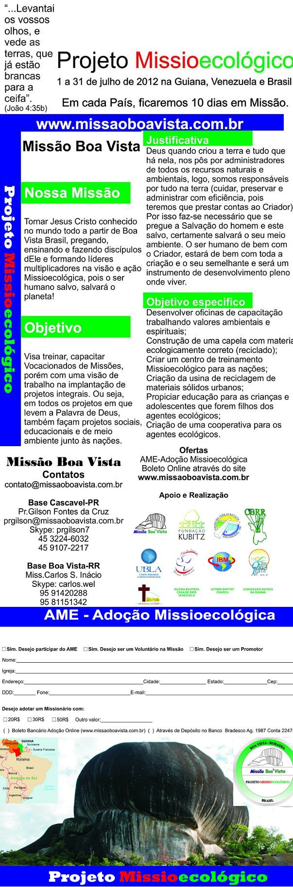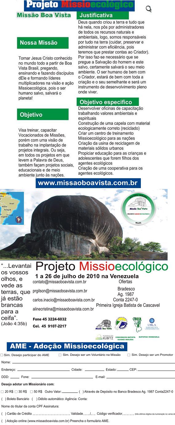 Fomos na 90ª Covenção Brasileia(CBB) e lá divulgamos para mais de 4000 lideres! certamente que temos alcançado vários estados do Brasil e fora! Inscrições no site! Estão abertas as inscrições para o projeto MIssioecológico, Missão Boa Vista em Santa Elena, Venezuela! para o mes de julho de 2010! Venha
