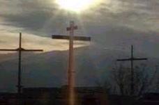 a lembrar de três cruzes , expostas ao olhar de uma grande multidão