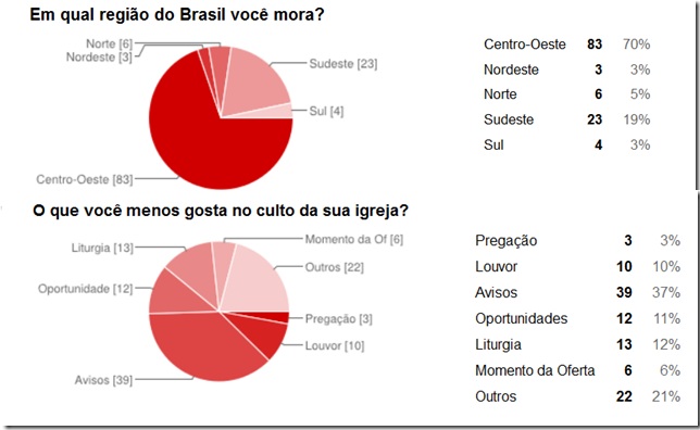 menos gosta no culto de sua igreja : Pregação 3% , Louvor 10% , Avisos 37% , Oportunidades
