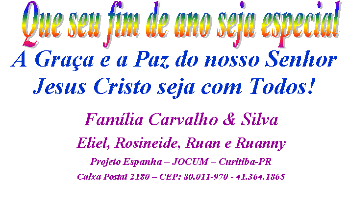perguntas sobre este artigo para: ashbell@cetai.com.br . CENTRO DE TEOLOGIA APLICADA INTEGRADA – CETAI MANTENEDORA FACULDADE JOÃO CALVINO– http://www.cetai.com.br Cetai Open University - http://www.cetai.com.br/cou Visitine -nos FEliz natal.... Feliz Natal Felicidade! Faça alguém feliz neste Natal! Um benefício qualquer que alegre o coração de uma pessoa. Embrulhando presentes, escrevendo cartões, lembre-se daqueles que tem menos, ou mesmo dos que nada tem. Leve algo para alguém! Você pensa, que não tem nada para oferecer? Apresente Jesus o Salvador! Imagine, invente... você pode ajudar alguém. Talvez seu vizinho! Mostre que só Jesus traz alegria verdadeira. Zelo, cuidado com alguém; pode ser um doente, Jesus pode modificar vidas através de você. As pessoas necessitam de um ato de amor. Nascimento de Jesus! Jesus já nasceu em nossos corações, vamos mostrar aos outros, a diferença. Aceitar, o meu próximo , amando-o aceitando-o como Deus o aceita, mesmo com falhas e limitações. Trabalhe, para que o orgulho, o ego, não o impeça de receber as bênçãos grandiosas que Deus tem para nos dar. Alegria; fique alegre, pois Jesus te ama; apesar dos pecados. Confesse, arrependa-se . Jesus perdoa! Liberdade. Nós somos livres , pois Jesus pagou o preço, veio a este mundo, quebrando todo preconceito. E não se esqueça: Faça alguém feliz neste Natal! Este desafio é pra mim, é pra você? Autora: Edslene D. P. Schütz Desejamos à vocês toda paz e felicidade do mundo ... para você e sua família. FELIZ NATAL!!!!! Edslene/James/Júnior/Lydia ![]() |