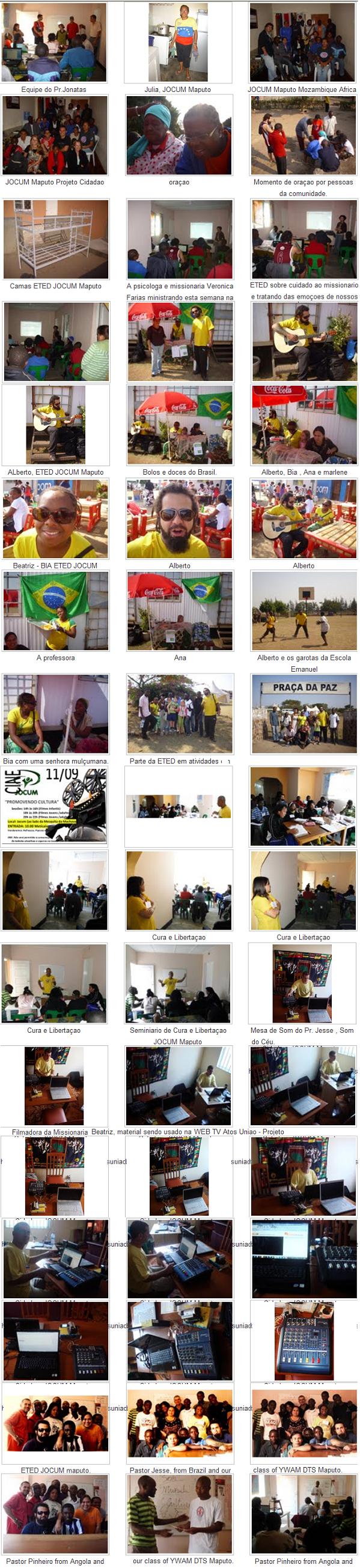 Domingos, Helton, Valens e Angelo. Empregos em Maputo e Matola Dirigido por Marlene Tarabillo DTS. Agosto-dezembro de 2010. Uma de nossas equipes prática da JOCUM DTS Maputo. Julia, Neta e Claudio, Anais em Maputo e Matola. Agosto-dezembro de 2010. DTS Dirigido por Marlene Tarabillo Uma de nossas equipes prática da JOCUM DTS Maputo. Alberto, Simeão, Beatriz, Amina Ismael e Paulo. Trabalhos nas províncias da Zambézia, Sofala e Niassa é também um momento Malawi. Agosto-dezembro de 2010. DTS Dirigido por Marlene Tarabillo Fred Berrington sendo apresentado por Marlene Tarabillo Jocum Maputo, foi palestrante na DTS e é missionária no norte do Niassa em Moçambique. Além de amigo. A equipe