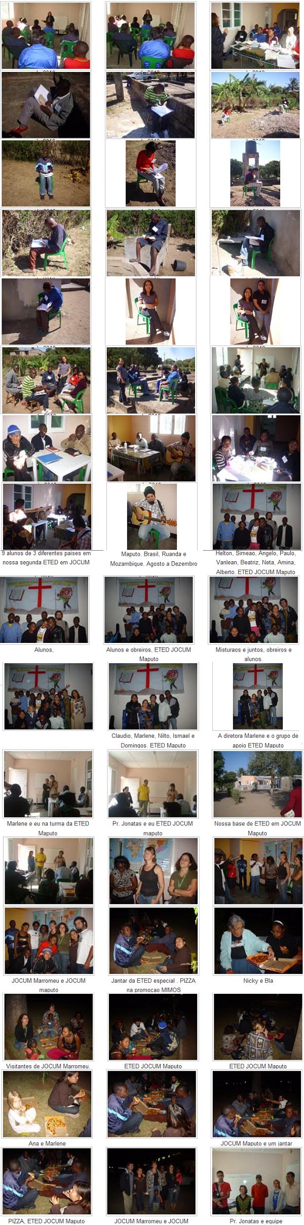 Paz e sucesso em Cristo Jesus nosso Senhor e Salvador. Hoje mando algumas informaçoes referente ao nosso mais novo desafio e trabalho. A nossa segunda ETED em (8) oito meses de Base de JOCUM Maputo – Moçambique na Africa. Importa lembrar aos amigos que a nossa Primeira ETED de JOCUM Maputo teve um numero de (5) cinco alunos e hoje contatos com 100% de envolvimento de nossos alunos em missões, ou seja eles permaneceram na missão. Nosso foco, objetivo, meta é treinar para que eles permaneçam em missões, queremos treina-los para que eles estajam indo as naçoes. Um pouco do perfil dos nossos alunos da nossa nova ETED, orem por nós e por eles. A ETED vai de Agosto a dezembro de 2010. Elton, Simiao, Angelo, sao co-pastores em suas igrejas aqui em Maputo. Lideres de ministerios em suas igrejas, sao experientes e maduros. Paulo, é lider nato, e tem ministerio na cidade com hospitais e presidios. Sao Moçambicanos. Neta e