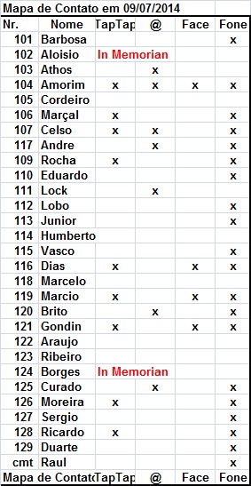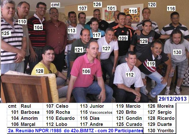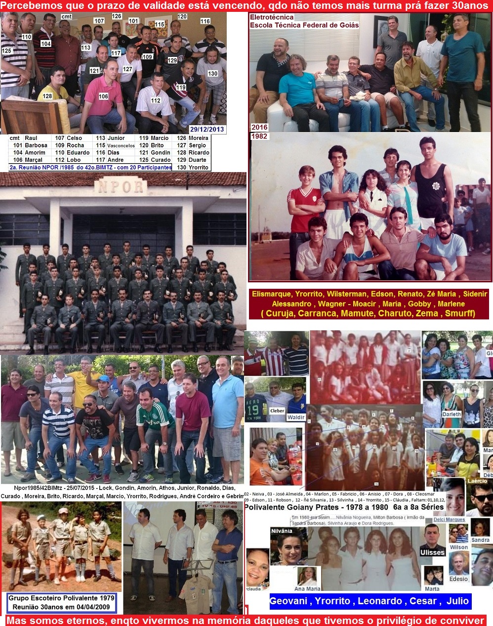noticias sempre. Grande abraco, Athos- - Te achei no : www.facebook.com/athos.oliveira.33 , te mandei um convite pelo : www.facebook.com/uniaonet.curtir . O nosso grupo no facebrok : www.facebook.com/groups/npor1985goiania , só o Márcio que usava , agora nem ele Cara num tem base esta correria , mas a gente vai se conectando . Foi muito bom o dpoimento do Junior sobre o encontro contigo , um dos melhores momentos da Festa . Depois da Festa tive contato com o André , no Dpto de Química da UFG prá pegar uns bizus pro meu menino q tá estudando lá , e com o Cap.Gondin e o Júnior prá orientar sobre alistamento . Depois teclamos mais , Vê se entra no Grupo e me adiciona Abração do seu tamanho , Yro Hoje 10/07/2014 (segundo o facebrok) é o níver do 129 , parabéns ao meu "TheRancho" , fui o privilégiado de em toda montagem de dupla da turma : era eu e o 129 . Parabéns Mano , muita saúde . 130 ![]() Gondim - SAUDAÇÕES,YRORRITO! QUE LEGAL. É SEMPRE BOM REVIVER ESSES MOMENTOS BONS DA VIDA. UM FORTE ABRAÇO. ![]() Dia 11/07 Niver do Maior da Turma : Athos Oliveira , parabéns ao nosso