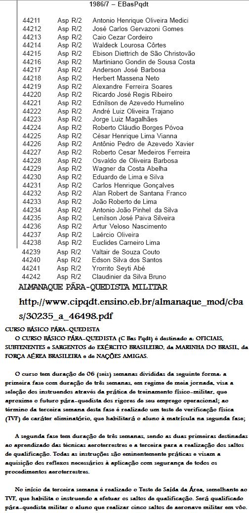 Desde já agradeço sua tenção e aguardo resposta. = = Jailto , Faz muito tempo que não tenho contato com o EB , estou repassando sua mensagem prá comunidade do NPOR no ORKUT : http://www.orkut.com/Compose.aspx?cmm=676719 , espero que o pessoal possa te ajudar .Yrorrito/NPOR/85 William Silva _ Boa noite, Com certeza não me conheces porém eu axei um site seu a respeito do NPOR. Eu me alisto neste ano e estou cursando faculdade estou analisando a carreira militar como uma opção, porem estou encontrando certas dificuldades em achar informações claras a respeito disso. Poderias me explicar ou me indicar um local onde eu ache informações sobre o assunto ? Como por Exemplo: O que faz exatamente um NPOR ? Por quanto tempo faz ? Quais as opções após esse tempo ? É possivel permanecer por mais de 7 ano no exercito ? Att. William da Silva Blumenau - Santa Catarina - - - Que viagem me fizestes fazer agora Willian, voltar cerca de 22anos num segundo ... como pode ver no : www.uniaonet.com/npor.htm , fiz o NPOR em 1985 , pelo q me falaram depois disso , o curso é um tal de EPOTI , com meio período e esforço moderado , ou seja nada a ver com o que fiz . tô repassando para o grupo : http://www.uniaonet.com/espmilitar.htm talves encontremos alguem com informações mais recentes . podes entrar nas comunidades do Yorkut , como a : http://www.orkut.com/Community.aspx?cmm=676719 Yrorrito CURSO BÁSICO PÁRA-QUEDISTA