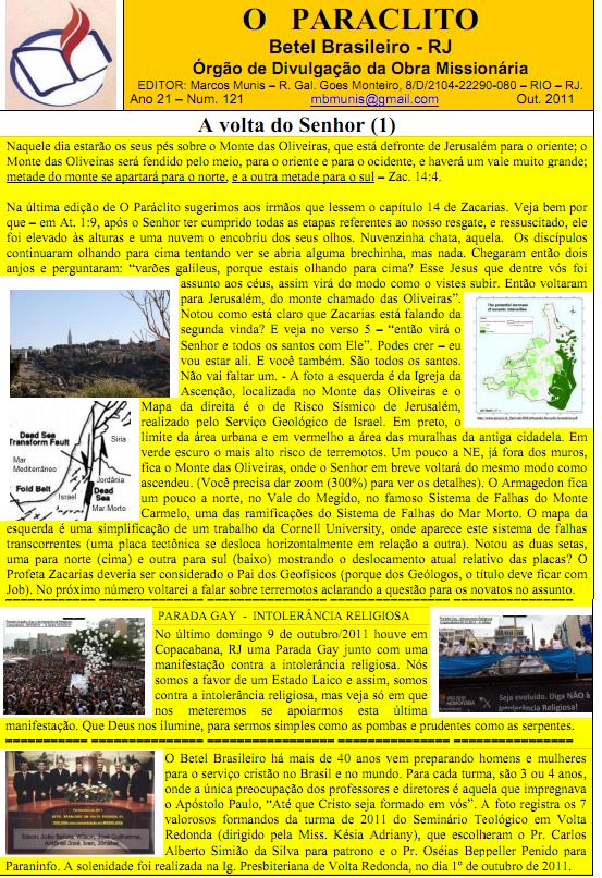 nossa Nação. Na realidade, apenas ratificaremos nas urnas, aquele que o Senhor, de antemão, pela Sua Soberania já escolheu (para o bem, ou para o mal). O capítulo 52 de Jeremias relata cruamente o episódio da queda de Jerusalém diante dos exércitos de Nabucodonozor, rei da Babilônia. Foi algo terrível, e dos 34 versículos, vou transcrever o 10 e o 11, para você ter uma idéia (e quem sabe, procurar ler toda a história) “Matou o rei da Babilônia os filhos de Zedequias à sua própria vista, bem assim a todos os príncipes de Judá, em Ribla. Vazou os olhos de Zedequias, atou-o com duas cadeias de bronze, levou-o à Babilônia e o conservou no cárcere até ao dia da sua morte”. Qual a razão de tanto sofrimento? – Numa passagem paralela, em II Cro. 36:15 lemos que o Senhor se compadeceu e muito, do seu povo, mas este não quis saber de arrependimento, de modo que “não houve mais remédio algum – verso 16”. Um dos jovens cativos levados para Babilônia chamava-se Daniel, que logo se tornou um dos principais, senão o principal conselheiro do rei. Exercia um cargo eminentemente técnico, e mesmo com influência política, não era a ela subordinado, tanto que, com a queda do reino da Babilônia, continuou servindo (e testemunhando) ao novo governante da Pérsia. Daniel por este tempo, já estava com uns 80 anos de idade, e entendeu “pelos livros” (Dan. 9:2), que seu povo estava na iminência de receber um grande livramento. Ao perceber este grande momento que se aproximava e que já tinha sido decretado setenta anos antes, como tinha sido notificado pelo Profeta Jeremias, Daniel não saiu gritando que tinha uma nova profecia, que o cativeiro do seu povo ia acabar ou coisas semelhantes que o povo estava querendo ouvir. Sentindo a grandeza do momento que estava vivendo, e a maldade contínua do seu povo, buscou ainda mais ao Senhor, com oração e súplicas, com jejum, pano de saco e cinza (Leia a oração intercessória de Daniel nos versos 4 a 19 do cap.9). - Aqui no Brasil, não temos tido uma história igual (pelo menos nunca tivemos um rei cujos olhos tenham sido vazados), mas já tivemos um alferes que foi esquartejado (Tiradentes), um mártir cristão reformado, que foi enforcado, (Jacques Le Baleur, c. 1560) e inúmeros missionários, que para nos trazerem as Boas Novas, aqui deixaram suas vidas, vitimados pela malária e febre amarela, que no século XIX e inìcio do XX eram endêmicas no Brasil. Nos últimos cinqüenta anos, temos sido abençoados sobremaneira. Liberdade plena na pregação do Evangelho fez com que hoje, estejamos próximos de 30% de participação evangélica, e continuamos crescendo. Somos talvez a Nação que atualmente mais envie missionários transculturais, e consequentemente, estamos deixando de ser cauda, na comunidade internacional, e passando a ser cabeça. Mas somos também uma Nação onde a iniqüidade tem crescido avassaladoramente. Crimes impunes, justiça que só serve aos ricos, sangue inocente derramado, clamando dia e noite ao Senhor, por falta de juízes. Precisamos fazer como Daniel. Interceder por esta Nação antes que seja tarde, e sejamos, todos nós levados em cativeiro. Ore, ore muito, ore sem cessar, por você, sua família, sua Igreja, sua Nação. E em 3 de outubro, vote consciente. E seja que resultado for, continue orando, e levante a cabeça, porque a nossa Redenção está próxima. – Marcos Munis. O PARACLITO