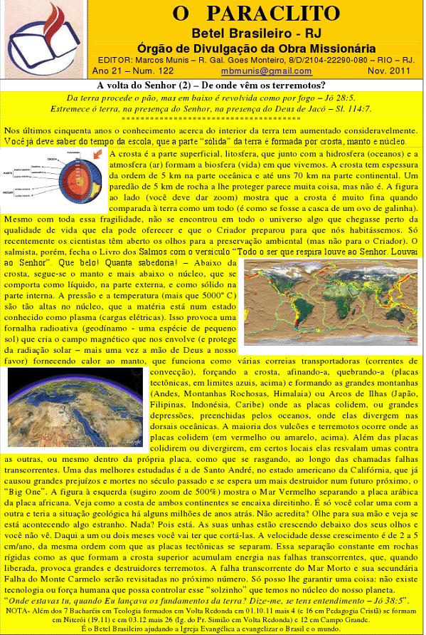 - Festa da Primavera na Estância Vale da Benção em Torre de Pedra, SP - 16-Out-2010. - Louve a Deus pela libertação do maranhense Dagnaldo Pinheiro Gomes, guia turístico que trabalhava no Cairo. Foi preso porque tinha uma bíblia e alguns folhetos em árabe no seu carro. Os crentes oraram, a embaixada interferiu e ele na sexta-feira passada já estava em São Paulo. Por pouco não se tornou mais um torturado por amor a Cristo. = = Ano 21 – Num. 120 - Set. 2011 As recentes catástrofes no Japão ...Ocorreu grande terremoto, como nunca houve igual desde que há homem sobre a terra... Ap 16:18 Em janeiro de 2008, Fernanda, minha esposa, foi ao Japão dar um curso de grego e de hebraico no Seminário do Betel Japonês em Sassagawa, Yokaichi, província de Mie, e eu tive a feliz idéia de acompanhá-la. Ficamos hospedados na casa da Missionária Eva (atualmente em Calcutá, India) que assessorava o Pr. Clovis na administração das igrejas e seminários no Japão. Ficamos encantados com o modo de vida do povo japonês e da comunidade brasileira que ali vive, trabalha, participa e produz riquezas para a Nação, como os japoneses fazem aqui no Brasil, se bem que, em muitos aspectos eles sejam completamente diferentes de nós. Subsídio, por exemplo, eles não querem nem ouvir falar. Têm um sistema nos ônibus urbanos, como o dos taxis aqui. Andou pouco, paga pouco, andou muito, paga muito. Nada de bolsa família, auxílio transporte, vale alimentação, etc. Eles preferem pagar salário. Parece coração duro e insensível com os pobres, mas o que eles querem realmente é um país sem pobreza. Seguem o que Paulo já mandava “se alguém não quer trabalhar, também não coma” 2 Ts 3:10, e o que a Presidente Dilma vem idealizando na nova logomarca do governo brasileiro: País rico é país sem pobreza. Mais um aspecto sobre o Japão - Durante a primeira metade do século XX o Japão desenvolveu um forte espírito militarista, expansionista e imperialista. A Coréia, por exemplo, foi invadida e até hoje os coreanos não esquecem. Como os japoneses foram derrotados na 2ª guerra mundial, se humilharam, e parece que o Espírito do Senhor se derramou sobre a Nação. Mesmo tendo uma religião majoritária budista, cientes que são expoentes no primeiro mundo, e como tais, menosprezando as idéias que procedem do terceiro mundo, os empresários japoneses respeitam os evangélicos e até pedem que orem pelos mesmos. Aí está a grande oportunidade de evangelizarmos os japoneses na sua terra. Em um culto que participei em Suzuka houve 10 batismos sendo 2 de japoneses e os outros, brasileiros, peruanos ou filipinos. Nos outros países desenvolvidos e de tradição evangélica, a situação é bem pior (exceção dos EUA) com total desprezo pelos valores que fizeram essas nações grandes. – O Japão passou por duas catástrofes recentes, o tsunami que provocou o acidente nuclear de Fukushima e o tufão Roke que devastou grande parte do país, inclusive a Província de Mie, onde se situa Sassagawa, e onde fizemos vários amigos. Os geólogos sabem que esta situação vai se repetir várias vezes, mas o Japão é a Nação mais bem preparada para esses transtornos. Não só o Japão, mas toda a região circunpacífica (cinturão de fogo), ou na região do Caribe, Califórnia, Himalaia, Alpes, Atlas, Urais onde as placas tectônicas se encontram ou deslizam umas contra as outras, ou ainda se separam como no fundo do Atlântico e Mar Vermelho (se propagando pelo Jordão), aflorando em algumas ilhas, como a Islândia, tudo pode acontecer. Mas nada se compara ao que está escrito no versículo acima citado, e que terá seu foco no local que a Bíblia chama de Armagedom. Detalhes você pode ler no capítulo 14 de Zacarias. Mas isso é assunto para um próximo estudo. (Esperamos, em próximos artigos, escrever sobre escatologia baseado em terremotos e os recentes ventos que têm soprado sobre o mundo árabe). Ano 21 – Num. 121 - Out. 2011 A volta do Senhor (1) Naquele dia estarão os seus pés sobre o Monte das Oliveiras, que está defronte de Jerusalém para o oriente; o Monte das Oliveiras será fendido pelo meio, para o oriente e para o ocidente, e haverá um vale muito grande; metade do monte se apartará para o norte, e a outra metade para o sul – Zac. 14:4. Na última edição de O Paráclito sugerimos aos irmãos que lessem o capítulo 14 de Zacarias. Veja bem por que – em At. 1:9, após o Senhor ter cumprido todas as etapas referentes ao nosso resgate, e ressuscitado, ele foi elevado às alturas e uma nuvem o encobriu dos seus olhos. Nuvenzinha chata, aquela. Os discípulos continuaram olhando para cima tentando ver se abria alguma brechinha, mas nada. Chegaram então dois anjos e perguntaram: “varões galileus, porque estais olhando para cima? Esse Jesus que dentre vós foi assunto aos céus, assim virá do modo como o vistes subir. Então voltaram para Jerusalém, do monte chamado das Oliveiras”. Notou como está claro que Zacarias está falando da segunda vinda? E veja no verso 5 – “então virá o Senhor e todos os santos com Ele”. Podes crer – eu vou estar ali. E você também. São todos os santos. Não vai faltar um. - A foto a esquerda é da Igreja da Ascenção, localizada no Monte das Oliveiras e o Mapa da direita é o de Risco Sísmico de Jerusalém, realizado pelo Serviço Geológico de Israel. Em preto, o limite da área urbana e em vermelho a área das muralhas da antiga cidadela. Em verde escuro o mais alto risco de terremotos. Um pouco a NE, já fora dos muros, fica o Monte das Oliveiras, onde o Senhor em breve voltará do mesmo modo como ascendeu. (Você precisa dar zoom (300%) para ver os detalhes). O Armagedon fica um pouco a norte, no Vale do Megido, no famoso Sistema de Falhas do Monte Carmelo, uma das ramificações do Sistema de Falhas do Mar Morto. O mapa da esquerda é uma simplificação de um trabalho da Cornell University, onde aparece este si