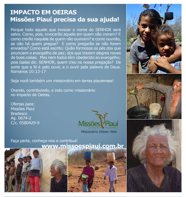 Mesmo com lutas, estamos muito felizes pela parceria dos irmãos e amigos. Muito obrigado por tudo! No mais, vamos ficando por aqui. Que o nosso Deus, Pai de misericórdia abençoe cada um de vocês. N’Ele e por Ele, Miss. Eliezer Neto MUITOS DESAFIOS, MUITAS VITÓRIAS. Olá queridos amigos, Paz e Graça! Estava com saudades de escrever para vocês! Certamente, os dias estão corridos para todos. As coisas por aqui estão caminhando de maneira muito intensa... Graças a Deus! Eis um resumo geral das nossas últimas notícias: Ausente dos trabalhos temporariamente Durante o mês de Novembro tive que me ausentar quase que totalmente dos trabalhos aqui no sertão por questão de saúde, pois tive que acompanha uma tia que teve um aneurisma cerebral que resultou em uma cirurgia na cabeça. Por este motivo praticamente fiquei todo o mês fora acompanhando ela na capital Teresina. Centro Missionário de Treinamento Prático no Sertão Há exatos quatro meses temos trabalhado na preparação do pratico missionário que acontecerá em Janeiro na cidade de São Lourenço do Piauí a uma distância aproximada de 550 km da capital, Teresina. São Lourenço é uma pequena cidade localizada na região sudeste do Estado com pouco mais de cinco mil habitantes, e que possui apenas 0,02% de cristãos evangélicos em todo seu território. São Lourenço possui uma área de 680,81 km². Sua população estimada para o ano de 2008 é de 5 041 habitantes. Sendo que no ano de 2007, o IBGE realizou uma contagem da população que apontou a existência de 77,5% dos habitantes vivendo na zona rural e apenas 22,5% na zona urbana. Segundo dados de pesquisa realizada no município de São Lourenço os participantes do prático missionário de Janeiro terão grandes desafios pela frente, pois ainda existe povoados inteiros na cidade de São Lourenço do Piauí que ainda não tem um crente fazendo deste prático uma grande sala de aula para os participantes, e uma urgência para a Igreja de Cristo na pregação do evangelho. Oração Nosso objetivo através dos nossos informativos é levantar um exercito de intercessores em prol do Estado do Piauí para que Deus venha com seu amor e poder salvar os sertanejos que vivem no Piauí. Pedidos de oração Orem pelo prático missionário em Janeiro para que deus venha suprir as nossas necessidades de alimentação, transporte e som da equipe. Orem pelos participantes que estarão vindo de vários lugares do Brasil, para que suas necessidades sejam supridas em Cristo Jesus. Orem pela saúde de todos os participantes e seus familiares. Orem pelas vidas que serão alcançadas durante o prático missionário. Agradecimentos Deus eu te louvo e te agradeço por tua bondade e misericórdia que tem nos sustentado a cada dia aqui. Pai também te louvo pela vida de todos os meus irmãos que tem se levantado como parceiros e cooperadores do ministério durante todo este ano de 2009. -- Miss. Eliezer Neto Qual será sua desculpa para não evangelizar o sertão do Piauí? JACÓ... Foi trapaceiro; LÉIA... Era feia; JOSÉ... Era um sonhador; MOISÉS... Tinha um problema de gagueira; RAABE... Era uma prostituta; DAVI... Foi um assassino; SALOMÃO... Foi mulherengo; ISAIAS... Tinha lábios impuros; JEREMIAS... Era muito jovem; ELIAS... Teve medo; JONAS... Fugiu de Deus; NOEMI... Era uma viúva; PEDRO... Era emotivo e negou a Cristo; MARIA MADALENA... Foi adultera; MARTA... Preocupava-se demais com as coisas; TOMÉ... Duvidava de tudo; ZAQUEU... Era usurpador; PAULO... Era religioso demais; TIMÓTEO... Tinha uma úlcera; LÁZARO... Estava morto! AGORA NÃO TEM MAIS DESCULPAS! Deus usou todos esses com seus defeitos, e agora conta contigo mesmo sabendo das tuas fraquezas! Deus quer usar você com todo o seu potencial! Apenas acredite nas promessas do Senhor! Depois de tudo isso o que você tem a dizer? Faltam 30 dias para o pratico missionário de férias no sertão do Piauí. Peça já o seu formulário ainda tem tempo! 13/12/2009 = = = Paz queridos irmãos! Hoje acordei assustado com um sonho que tive... sonhei que estava com um pequeno grupo de pessoas em uma casinha no meio do mato eque tinha um homem armado querendo nos matar. Bom... o sonho foi grande e muito forte... quando acordei do sonho logo percebi que se tratava de uma batalha espiritual que Deus estava me alertando, pois estamos a menos de uma semana para o inicio do nosso prático missionário na cidade de São Lourenço do Piauí. Entendo que estamos no meio de uma guerra espiritual onde nosso inimigo não quer o nosso avanço, mas também vejo o agir de Deus em nossas vidas... por isso que te desafiar a ser nosso parceiro neste jornada. Esteje orando por nosso tempo naquela cidade! Ore para que nossas necessidades sejam supridas em Cristo Jesus. Necessitamos de 400 para alimentação da equipe, transporte da equipe pelo pequenos povoados e som. Se você realmente ama a obra de Deus nos ajude neste projeto! 05/01/2010 21/01/2010 Paz e Graça!