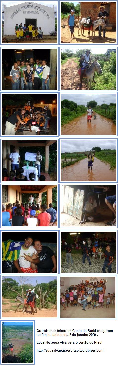 Os trabalhos feitos em Canto do Buriti chegaram ao fim no ultimo dia 2 de janeiro, o que nos deixou saudosos, pois cada momento ali foi vivido com amor pelas vidas conhecidas. Deus com toda certeza preparou cada minuto vivido ali… Cada momento com a igreja… Cada culto nos povoados… Cada tarde de futebol com os jovens e crianças… Cada programa de rádio feito… Cada visita feita as garotas de programa da cidade… Todo tempo investido na cidade de Canto do Buriti foi e será para Glória do Nosso Deus! Meu desejo aqui era poder relatar tudo que vivemos em Canto do Buriti nos últimos 30 dias… Poder relatar cada visita feitas as irmãs que por um problema ou outra circunstância não podem ir aos cultos… Cada estudo ministrado ao pequeno grupo de adolescentes da igreja… Cada Escola Bíblica Dominical com os músicos da igreja… Sem falar à emoção que é poder participar dos cultos nas congregações. Queria aqui poder escrever cada aventura vivida pelos Missionários Filipe Ximenes e Fagner Tiago durante os dias em que eles ficaram nas congregações do Jenipapo, Tabuleiro, Retiro onde foram canais de bênçãos na vida de cada um ali. Então como não posso escrever tudo vou tentar passar cada situação vivida registradas através das fotos que foram feitas, pois entendo que elas podem traduzir melhor o que desejo compartilhar com os amados amigos e irmãos… Que através de cada foto aqui Deus fale poderosamente ao teu coração, e que você venha fazer parte de futuros projetos aqui no sertão do Piauí. 05/03/2009 Paz e Graça!!! Bom... Não sei se este e-mail será do agrado de todos os irmãos, mas tenho que compartilhar com cada um de vocês... Tenho procurado ser claro e objetivo no meu ministério em relação a tudo o que acontece até por que somos parceiros e companheiros de ministério, pois entendo que sozinho não poderei ir muito longe. Em 2008 sente um desejo muito de grande de poder aprender um pouco mais do Senhor... Cresceu dentro de mim uma vontade de poder reciclar tudo o que aprendi durante todos esses anos de ministério... Procurei fazer escolas de treinamento para melhor servi o corpo de Cristo. Desde Julho do ano passado quando deixei a liderança do Missões Piauí para poder trabalhar com igrejas locais no sertão do Piauí Deus tem me levado a um aprendizado muito grande provando que Ele mesmo nos ensina da maneira que Ele quer. Amados confesso que mesmo sabendo as Soberania de Deus, e conhecendo que todas as coisas são para o nosso bem venho enfrentando momentos não muito bons em meu ministério... Estou sem mantenedor o que me deixa impossibilitado de fazer os trabalhos como antes. Queridos venho pedir as orações de vocês, pois se as coisas continuarem assim não sei se poderei dar continuidade aos trabalhos aqui no sertão. -- Miss. Eliezer Neto 23/04/2009 O semi árido brasileiro faz parte dos nove Estados do nordeste e são milhares de quilômetros quadrados. É muito chão! As distâncias entre as cidades são enormes e há milhares de pequenos povoados vivendo praticamente no anonimato, esquecidos pela mídia e pela sociedade, negligenciados pela política e infelizmente também pela igreja. Quanto maior o Estado, maior o abandono e lentidão dos acontecimentos. Quanto mais distante das capitais, menor o número de crentes e de obreiros. Trabalhar para o resgate do sertanejo é trabalho missionário, pois é necessária a ajuda e suporte das igrejas dos grandes centros urbanos no envio e manutenção de obreiros; mas até quando esperar que as igrejas acordem? Deus, na Sua sabedoria e amor, tem despertado e levantado pessoas em cada Estado para trabalhar na expansão do Seu Reino a partir de locais estratégicos como é o caso do sertão sul do Piauí e do missionário Eliezer Neto. Muitas vezes o anseio dos obreiros em querer avançar é freado pelas limitações e o Eliezer tem aprendido a filtrar suas emoções e a aguardar com serenidade a vontade do Senhor, pois quando Deus quer, a Sua vontade SEMPRE é feita. Nunca faltarão recursos para a obra missionária, por menor que seja o recurso de um missionário e trabalhar para o Senhor no sertão nordestino tem trazido muita alegria e confiança no suprimento divino. A oração que o Senhor Jesus nos pediu (a única que ele nos pediu) foi para pedirmos ao Dono da seara que envie obreiros. Que o Senhor desperte e envie obreiros para o sertão sul do Piauí e fortaleça o trabalho que já tem sido desempenhado com fidelidade e amor. Amém. Parabéns pelo trabalho. Deise Machado 13/05/2009 Queridos amigos e irmãos, Quero passar a cada um de vocês o link do nosso pequeno vídeo que fizemos , e postamos no You Tube... Queremos comoobjetivo principal mostra um pouco do nosso trabalho aqui no sertão do Piauí. Por favor, não deixe de ver o que Deus tem feito em nossa terra! http://www.youtube.com/watch?v=fj5hlBA6jQc http://aguavivaparaosertao.wordpress.com 9 de junho de 2009 Nos últimos dias os telejornais de todas as televisões do Brasil noticiaram os estragos sofridos pelo povo do Piauí causados pelas fortes chuvas e pelo rompimento da barragem de Algodões no norte do Piauí. É realmente triste pensar que as chuvas tão esperadas para aliviar o sofrimento do sertanejo venham com tamanha fúria a ponto de matar e destruir tudo que o sertanejo tem para viver no sertão do Brasil. Meu coração fica paralisado ao ver nos jornais tamanho estrago promovido pela força das águas. Mas o que me deixa mais agoniado não é ver o que tem feito a força das águas no Piauí, e sim saber que além de perde tudo com as fortes chuvas o povo do sertão tem morrido sem conhecer a salvação. Existe um ditado popular que diz: “vão-se os anéis e fica-se os dedos” o que é verdade, pois o sertanejo é um povo forte e com certeza vai lutar para recuperar tudo que a chuva levou... Mas existe algo que o sertanejo não pode recuperar depois da morte que é a salvação que o poder do ev