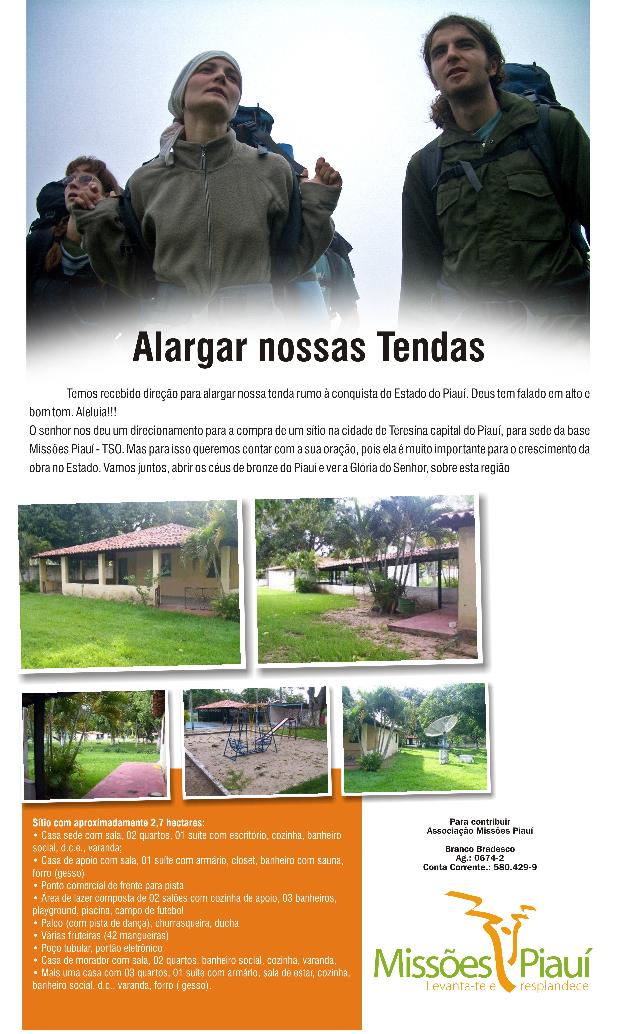 É HORA DE PLANTAR, PARA SEMEAR VIDAS.Muitos falam em ser missionário, que querem ir para a África para levar o nome de Jesus a comunidades que nunca ouviram falar do nosso Senhor, ou até podem já ter ouvido, mas se encontram num estado de calamidade e sofrimento tão grande que se esqueceram. Mas, o que poucos sabem é que não precisam ir tão longe para achar essas pessoas. No Piauí apenas 9% da sua população, em média, é evangélica (conforme dados do IBGE), sendo o Estado mais idolatra do Brasil. É nesse contexto geográfico, principalmente no sul do estado que existem famílias que vivem uma vida de miséria, sem alimento, água, saúde e esperança, sem acesso à dignidade ou ate mesmo a integridade de um homem, vivem sem nenhuma palavra de conforto, numa sociedade fechada para obra do Senhor. Precisa ir longe? Deus esta mostrando algo novo para esse Estado. Surge uma voz que clama no deserto, mais precisamente em São Raimundo Nonato. A “MISSÕES PIAUÍ”, que já há um ano vem propagando e estendendo as tendas do evangelho nesse estado, levando até essas comunidades um novo ânimo, e esse ânimo se chama Yeshua (Jesus). É um novo ano, assim também uma nova caminhada, novos desafios e novas vitórias, cremos que esse é o ano da Conquista, o ano em que o Piauí vai ficar em chamas, cheios da presença do Espírito Santo. Deus tem dado visões para esse Estado, tem trazido para o coração da Missões Piauí, muito além do que apenas ganhar vidas, mas preparar nesse Estado um caminho para que o Senhor Jesus possa passar. Deus tem nos revelado que virão missionários de todos os Estados do Brasil para nos ajudar, sendo de dois a dois, cada um com a chama do Espírito Santo, e os mesmos depositarão aqui no Piauí. Missionários trazendo um avivamento novo, cheio de unção, e capacidade para mudar e trabalhar, cremos que isso seja revelação do Senhor, pois está na hora de começarmos a plantar: oração, jejum e clamor para podermos semear vidas. “Se o meu povo, que se chama pelo meu nome, se humilhar, e orar, e me buscar, e se converter dos seus maus caminhos, então, eu ouvirei dos céus, perdoarei os seus pecados e sararei a sua terra.” II Crônicas 7:14 Esse ano será marcado para cada um de nós, pois iremos levantar o Centro Missionário aqui em São Raimundo Nonato, para hospedar esses missionários que por sua vez virão de todos os cantos do Brasil, pois cremos que à medida que você for lendo isso, Deus vai tocar o teu coração e te levantar de onde você estiver para ser um dos nossos. Estaremos aqui te esperando jovem missionário, para romper com as estruturas do inferno, quebrar as maldições e proclamar QUE SÓ JESUS É REI NO PIAUÍ. No amor de Cristo Eliezer Neto Líder Projeto Missões Piauí = = = Graça e Paz! Venho por meio desta pedir aos irmãos para ser um conosco em oração para que possamos ver o nosso Deus operando em nossas vidas. Como missão no sertão sul do Piauí entendemos que somente através da oração do povo de Deus é que temos vitória em Cristo Jesus. Queremos em nome de Jesus abrir nossa casa missionária para poder dar inicio ao nosso projeto social e evangelistico na região. Queremos abrir a CASA MISSIONÁRIA até o final de janeiro próximo e queremos contar com sua ajuda. Necessitamos de 500 reais por mês para poder manter a casa aberta. Por favor ore para que Deus nos envie parceiros, e mantenedores para essa obra que não é nossa e sim do Nosso Deu Espero poder contar com as orações dos irmãos. No amor de Cristo. Eliezer Neto Líder Missões Piauí December 16, 2005 : Graça e Paz! Bem nos foi doado um terreno para a construção da base missionária, e para que possamos dar inicio as obras necessitamos de um projeto de um arquiteto e aqui na cidade não tem um nossa área para construção é de 58m² vc pode nos indicar um arquiteto cristão que possa nos ajudar? mesmo que ele cobre por seus serviços não tem problema. Queremos construir nessa área de 58m² salas de aula, cozinha, refeitório, alojamento feminino e masculino, espaço para cultos, escritórios para administração. Espero contar com sua ajuda. No amor de Cristo. Deus abençoe. Projeto Missões Piauí www.missoespiaui.com.br - - Amados, conheço um aqui no Rio de Janeiro, que não é Cristão. Se quiser posso tentar conseguir os contatos dele. Qq coisa, basta me falar. Obrigada _ Cristiane Oliveira - -