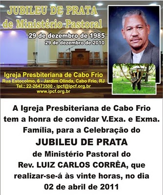 especial com a sua presença :Jubileu de Prata de Ministério Pastoral (29/12/1985 a 29/12/2010) do Rev. Luiz Carlos Corrêa , participe ás 20:00 do dia 02/04/2011 na Igreja Presbiteriana de Cabo Frio Rua Estocolmo, 6 Jardim Olinda - RJ Rv. 03/03/2011 Luiz Carlos _ Ontem de noite, visitamos uma família que está frequentando a nossa igreja. Apresentamos o folheto evangelistico que fizemos: "Você quer receber o presente da vida eterna?" Depois da apresentação o dono da casa tomou a decisão por Jesus. Foi algo maravilhoso! Nada se compara ao privilégio de sermos instrumentos de Deus para a salvação de uma alma. - - - Marcos _ Luiz ,na minha biblia tem uma inscrição com data de 29/12/1985,onde diz o seguinte: O Luiz não é mais Luiz agora é Rev. Luiz , hoje foi seu ultimo dia aqui, sei que vai nos visitar, mas, não estará conosco aciduamente. Deus o abençoe Luiz.Vá mas volte. Também está registrado o seu ultimo sermaão que foi no dia 15/12/1985 , o Presbitero Luiz pregou num tempo record de 13 minutos. E ainda recebeu parabéns. È o que lhe desejo nesse momento todo especial. Parabéns. Seu amigo ,Marcos Valério. - - - Pastor, Deus continue abençoando o seu Ministério. Parabéns! _ Presb. Gener e Vera - - - HENRIQUE_ DEUS prolonga os dias, sejam de vida como do Ministério, quando estamos cumprindo a tarefa que Ele nos confiou. DEUS continua abençoando grandemente a sua preciosa vida. Parabéns! 12/03/2011 Querido (a), Estamos enviando o nosso boletim de domingo e aproveitando a oportunidade para fazer um convite muito especial: No dia 2 de abril, às 20h, estaremos celebrando a Deus com muita gratidão por 25 anos de ministério pastoral. Gostariamos muito de contar com a sua presença neste dia que será muito especial na minha vida e na vida de minha família. Por isso, estou enviando um convite que é geral, mas muito pessoal e particular para você sua familia. Desejamos a você e sua familia, um final de semana ricamente abençoado por Deus. Abraços Rev. Luiz Carlos 20/03/2011 _ Querido (a), Estamos enviando o nosso boletim de domingo, desejando um domingo muito abençoado e especial para você e sua família. Queremos aproveitar a oportunidade para convidar você e sua família para as festividades de aniversário da nossa igreja que acontecerão no final do mês de março e inicio de abril. Sua presença conosco será muito especial e importante. Abraços Rev. Luiz Carlos Correa Veja as noticias de nossa igreja no link: http://www.ipcf.org.br participe da VIA ALTERNATIVA NO PRÓXIMO SÁBADO Mensagens sobre Missão Chile ver : www.uniaonet.com/amschile.htm Segue o nosso boletim de domingo que se encontra no site de nossa Igreja, e pode ser acessado facilmente. http://www.ipcf.org.br Lá voce irá encontrar também fotos, videos e informações sobre a nossa programação de aniversário que foi muito especial e abençoada. É só procurar na página inicial: aniversário de 38 anos ou acessar diretamente o link: http://www.ipcf.org.br/?pg=aniversario Queremos lembrar também que neste final de semana teremos a clinica de mentoria de pastores e lideres e você ainda pode se inscrever. Se você é pastor ou lider de uma igreja, nào deixe de participar. Deus abençoe muito a sua vida e espero que você tenha juntamente com sua familia um final de semana muito abençoado. Abraços Rev. Luiz Carlos Correa Cabo Frio encontra-se em luto. Ontem foram assassinado barbaramente o Vereador Aires Bessa e um assessor chamado Luciano. Os dois se encontravam em um restaurante na parte da noite no Segundo distrito de Cabo Frio quando foram abordados por duas pessoas em uma moto que efetuaram os disparos ocasionando a morte do vereador e do seu assessor. Este é um momento triste e terrivel em nossa cidade. Precisamos buscar a face do Senhor nosso Deus a favor de nossa cidade para que tragédias como esta não se torne lugar comum. Oremos também pelas familias enlutadas para que a graça de Deus traga consolo para elas. No temor do Senhor, Rev. Luiz Carlos Correa Querido (a) Estamos enviando nosso boletim de domingo, lembrando: Este domingo é muito especial por duas coisas: 1) Teremos um almoço comunitário missionário em que cada familia da igreja trará o seu almoço de domingo para juntos termos um tempo de comunhào e confraternização, e as sobremesas serão vendidas para levantarmos fundos para os missionários que ajudamoss financeiramente/ 2) O nosso culto de domingo de noite, será um culto temático: Celebrando a Deus com salmos. o coral, duetos, solos e musicas juntamente com a pregação serão baseadas nos salmos. Venha estar conosco neste domingo. Tenho certeza que você será muito abençoado. Aproveitamos a oportunidade para desejar a você e sua familia um final de semana muito abençoado. Abraços Rev. Luiz Carlos Correa Obs. Se por acaso voce ler este e-mail antes de sábado a noite, convidamos você e sua familia para uma programação muito especial e diferente; VIA ALTERNATIVA, venha ver, você vai gostar muito. == = ... dia 18 de junho teremos em nossa igreja o workshop: Evangelizando com as mãos... junto com o ministério de Evangelismo Explosivo no Brasil... viabilize a participação das pessoas envolvidas na área de evangelização da Igreja. ... Rev. Luiz Carlos Correa _ Presb. Cabo Frio Querido (a), Estamos enviando o nosso boletim de domingo, lembrando algumas coisas: 1) Teremos nesta semana, a semana de oração com toda a Igreja, das 19 às 22h. 2) Na sexta-feira, acontecerá o nosso jantar dos namorados no Chico's Restaurante 3) No dia 18 de junho, teremos o workshop: O EVANGELHO EM SUAS MÃOS. Queremos desejar para você e sua familia um domingo muito abençoado e enriquecido com as mais ricas bênçãos de Deus. E mais uma vez, estando em Cabo Frio e podendo, nos faça uma visita. Abraços Querido (a), Estamos enviando o nosso boletim de domingo, desejando um domingo ricamente abençoado por Deus para você e sua familia. No próximo