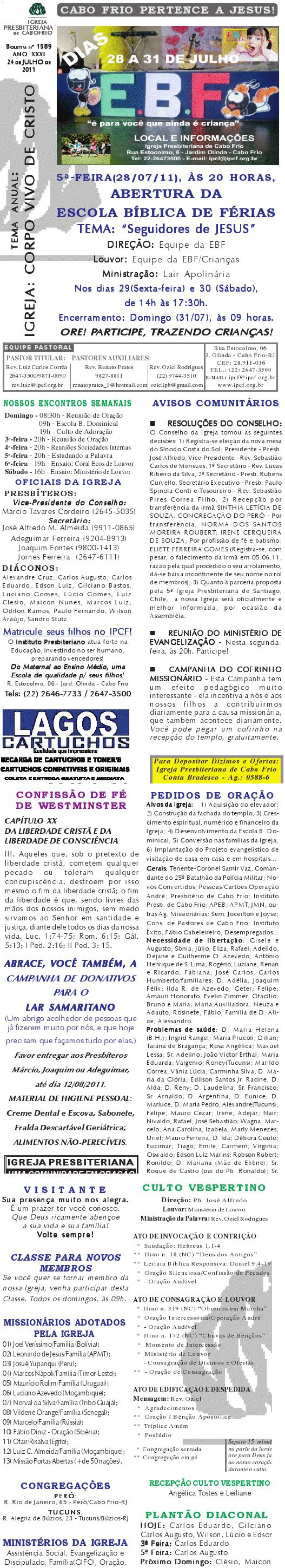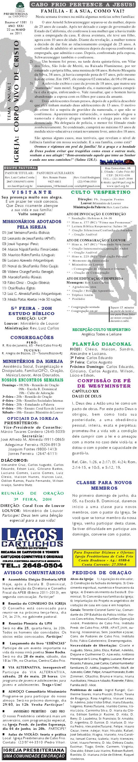02/01/2011 _ Querido (a), Estamos enviando nosso boletim, desejando a você e sua familia um ano novo cheio de felicidade e das copiosas e maravilhosas bênção de Deus. Se passar por aqui nas férias, por favor, nos faça uma visita. Será um prazer receber voce em nossa igreja. Abraços Rev. Luiz Querido (a), Este mês, entre os dias 5 a 27/01/2011 , a nossa igreja estará envolvida em alguns projetos missionários transculturais. Por isso, estamos enviando esta carta de oração para que você nos ajude, sendo a nossa retaguarda de oração durante este mês de janeiro. Abraços e um ano de 2011 muito abençoado. Rev. Luiz Carlos - - - IGREJA PRESBITERIANA DE CABO FRIO PRESBITÉRIO DE CABO FRIO Conselho Missionário Cabo