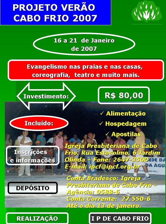 Querido (a) irmão (a), A nossa Igreja Presbiteriana de Cabo Frio estará realizando em janeiro de 2007, entre os dias 16 a 21, a quarta edição do Projeto Verão Cabo Frio, que tem como objetivo equipar Jovens e adolescentes com ferramentas eficientes para uma evangelização eficaz e criativa. Queremos pedir a sua ajuda na divulgação deste evento que cremos será muito importante para os nossos jovens e adolescentes. Segue em anexo um cartaz de divulgação. Você pode ter mais informações no site: http://www.ipb.org.br no link Jornal BP: Jovens de todo o Brasil evangelizam em praias e praças de Cabo Frio em janeiro Desde já agradecemos a sua atenção e colaboração Abraços _ Rev. Luiz Carlos Correa Pastor da Igreja Presbiteriana de Cabo Frio - www.ipcf.org.br _ = = Querido (a), Estamos no meio do Projeto Verão Cabo Frio 2007. Veja algumas fotos do trabalho. Até agora já distribuimos através da abordagem pessoal nas ruas e nas casas: 1800 livros da vida 1000 folhetos: O nosso povo está com a esperança morta 1500 cartões do Disque Paz Ore por nós. Abraços Rev. Luiz Carlos Correa .
