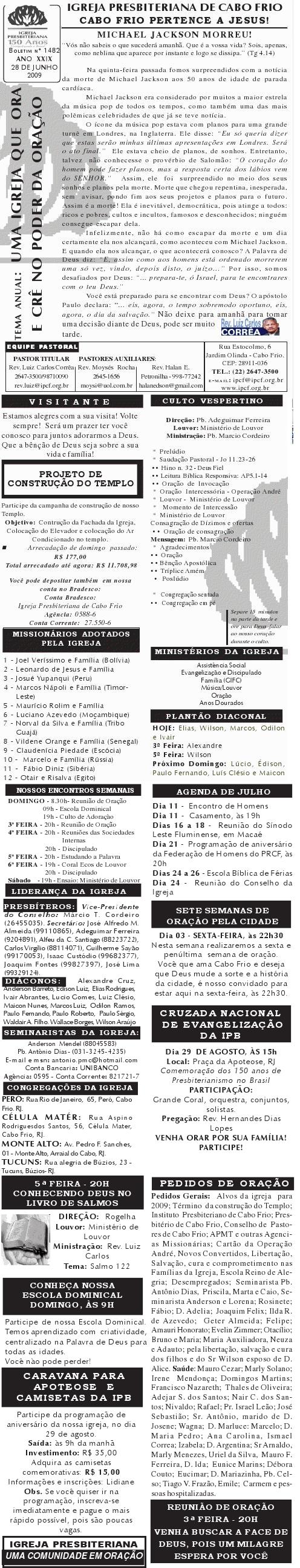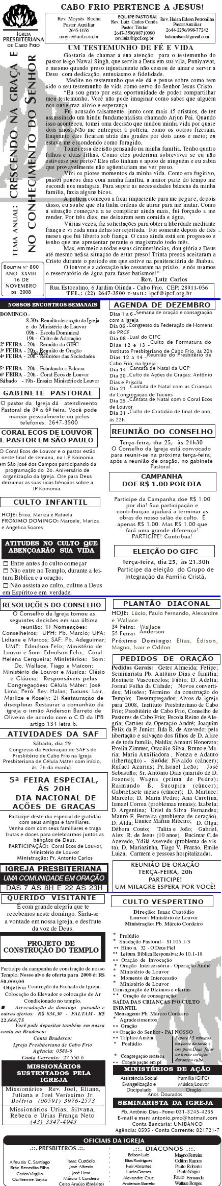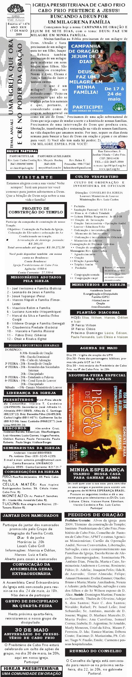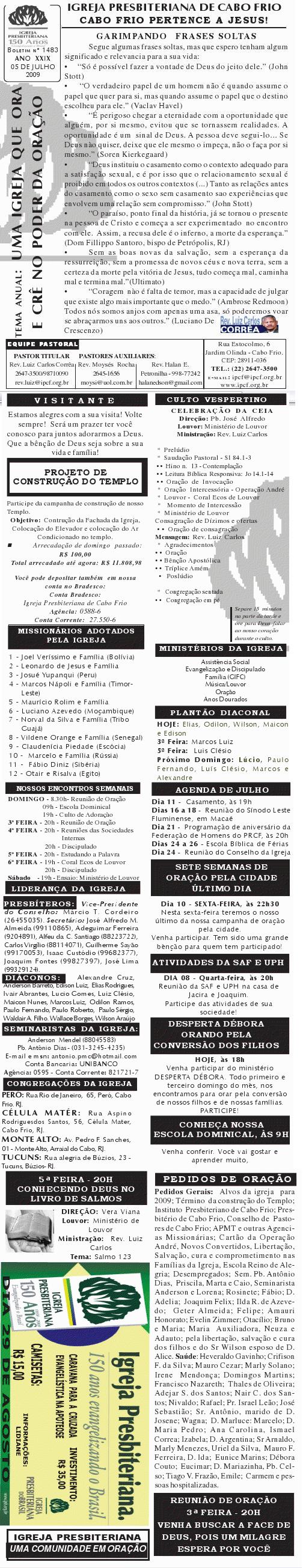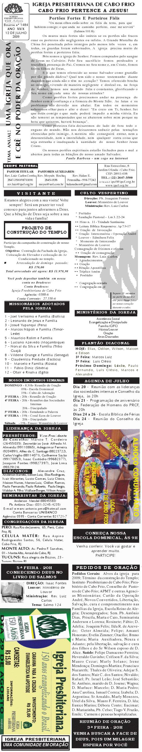 18/07/2010 Querido (a), Estamos enviando mais um boletim de nossa igreja, desejando as mais ricas bênçãos sobre a sua vida e família e um final de semana muito abençoado por Deus. Abraços calorosos de uma congelante Curitiba. Rev. Luiz Carlos ![]() Querido (a), Estamos enviando o nosso boletim de domingo. Junto com o boletim estamos tomando a liberdade de enviar as fotos do nosso projeto de construção da fachada. Não é o projeto definitivo, mas é pelo menos 90% do projeto definitivo. É um grande desafio que temos para concluirmos o nosso templo. Se por acaso, você quiser nos ajudar e participar deste desafio conosco, no boletim tem o número da conta bancaria de nossa igreja. Se o seu coração for movido pelo Espírito Santo para nos ajudar, será um prazer receber a sua ajuda por meio de oração e ofertas. Nossa oração e desejo é que você tenha um final de semana muito abençoado juntamente com sua família. Abraços Rev. Luiz Carlos Correa Igreja Presbiteriana de Cabo Frio = = = ![]() Querido (a), Estamos enviando o nosso boletim de domingo. Queremos lembrar duas programações em nossa em igreja: 1) No sábado, dia 14, às 20h. haverá o lançamento do livro do pastor William Barcelos: EU TENHO SETE MIL. Um livro muito bom, refletindo sobre os sete mil que não se curvaram diante de Baal. Venha ver o lançamento do livro. Você vai gostar. 2) No próximo domingo, dia 15, às 12h, teremos o almoço missionário comunitário. Estaremos juntando nossas panelas para almoçarmos juntos e contribuir para missões. Aquela comida de domingo que você costuma comer, traga para a igreja e vamos desfrutar de comunhão, muita alegria e ajudar os missionários. Participe conosco. Desejamos a você e sua família um final de semana muito abençoado, e tendo um tempo, nos faça um visita. Será um prazer receber você e sua família em nossa igreja. Abraços Rev. Luiz Carlos
