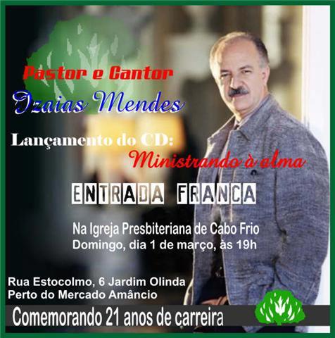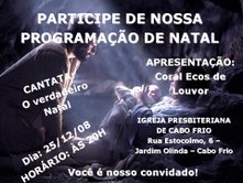 Querido(a), A partir da Quinta-feira, dia 29/03/2007, estaremos comemorando mais um ano de existência em Cabo Frio como Igreja Presbiteriana e queremos convidar você e sua familia para participarem conosco desde momento muito especial. Abraços Rev. Luiz Carlos Correa Pastor da Igreja Presbiteriana de Cabo Frio