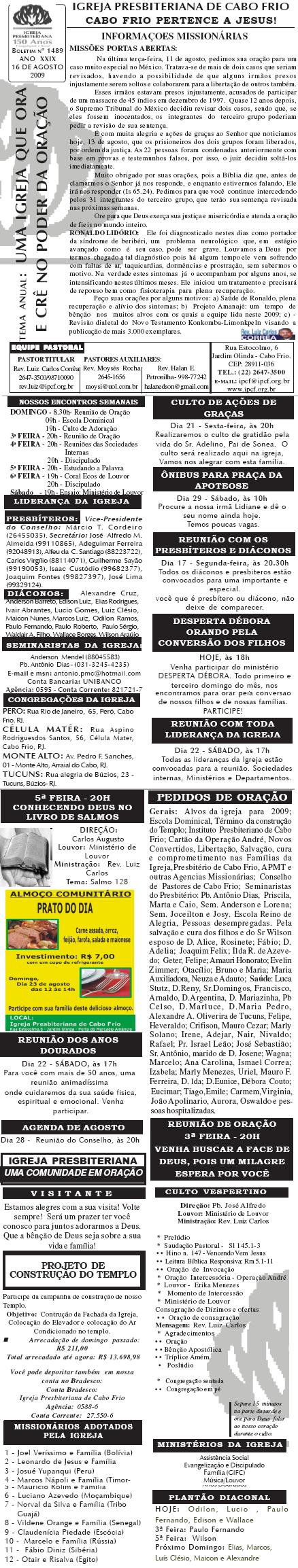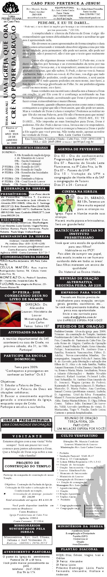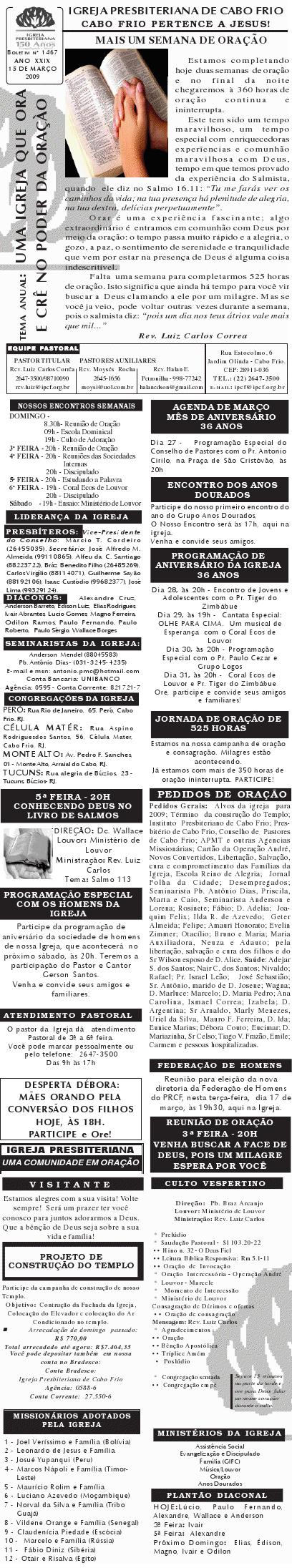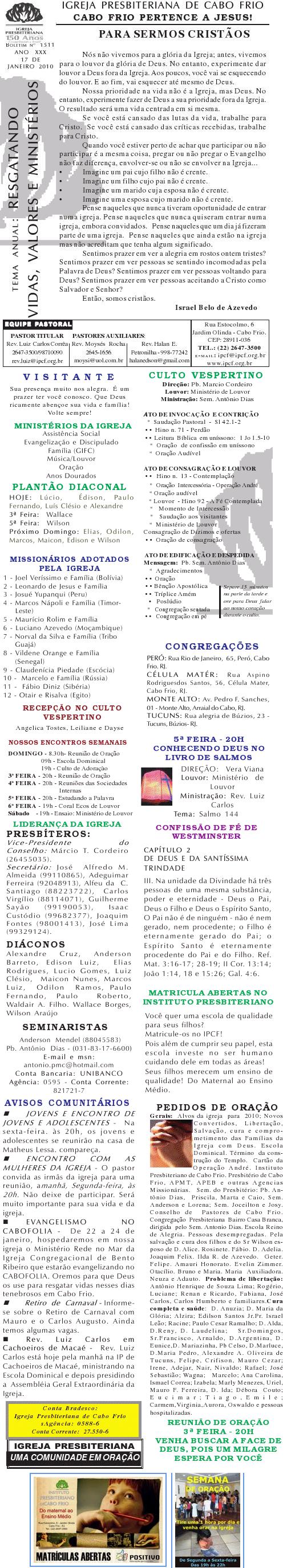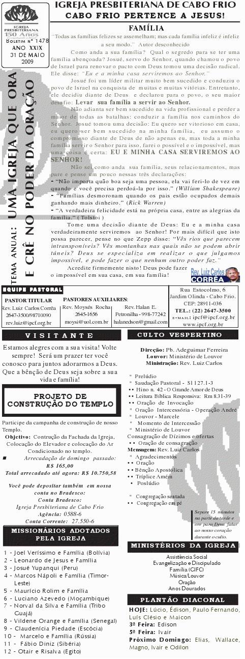 Querido (a), Estamos enviando mais um boletim de domingo ( 15/08/2010) : Lembrando: 1) No domingo teremos o nosso almoço missionário. vamos juntar as panelas e comidas. Se você quiser estar conosco, será um prazer. Traga a sua comida e vamos juntos nos alegrar e contribuir para missões; 2) No culto vespertino, receberemos alguns novos membros por profissão de fé e batismo, batismo infantil e jurisdição a pedido. venha participar deste momento importante na vida de nossa igreja. Desejamos a você e sua família um domingo muito abençoado. Abraços Rev. Luiz Carlos 20/08/2010 Querido (a), Estamos enviando o nosso boletim de domingo, lembrando: 1) Por ocasião de nossa Escola Dominical neste domingo, teremos um trabalho especial com casais promovido pelo Grupo de Integração da Família Cristã. Será um estudo sobre as quatro estações do casamento. Se você quiser saber qual é a estação do seu casamento, compareça. Será às 9h. 2) No próximo sábado, dia 28, às 20h, os nossos jovens e adolescentes realizarão uma programação muito especial voltada para jovens e adolescentes. O Tema é OPERAÇÃO JUVENTUDE. Será muito especial e diferente. Se você é jovem ou adolescentes ou se considera com tal, venha participar. No mais, desejamos um final de semana repleto das bênçãos divinas para você e sua família. Abraços Rev. Luiz Carlos Querido (a), Estamos enviando mais um boletim de domingo, lembrando: 1) neste sábado, se você abrir até sabado de tarde, teremos uma programação muito especial para jovens e adolescente em nossa igreja. Será às 20h. 2) queremos pedir a sua ajuda em oração para o pai do Rev. Edison Aguiar, que também se chama Edison Aguiar. O estado dele é grave, pois temos 06 veias que irrigam nosso coração, e ele está com 04 entupidas. Foi feito um cataterismo na aorta, e foi feito um dilatamento, pois ele se ressentiu muito do exame, e o sucesso foi pequeno. 3) externamos a nossa graditão por sua oração pelo missionário Dagnaldo que tinha sido preso no Egito e estava desaparecido. Graças a Deus ele foi localizado e já foi deportado para o Brasil. No mais, desejamos um final de semana ricamente abençoado por Deus para você e sua familia. E passando por Cabo Frio, nos faça uma visita. Abraços Rev. Luiz Carlos Querido (a). Estamos enviando o nosso boletim de domingo. Lembrando: 1) Não esqueça do nosso delicioso café da manhã, neste domingo, às 8.30h. 2) No dia 18 de setembro, teremos o nosso dia da família presbiteriana com todas as igrejas do Presbitério em Silva Jardim. Participe conosco! Queremos desejar um final de semana muito abençoado para você e sua família. Abraços Rev. Luiz Carlos Correa Querido (a), Segue o nosso boletim de domingo, desejando um final de semana muito abençoado por Deus para você e sua família. Estamos enviando um cartaz. Ainda não é o cartaz definitiivo, sobre o projeto missionário Chile, que acontecerá dos dias 5 a 27 de janeiro de 2011, em parceria com a Iglesia Presbiteriana "Cristo Mi Pastor". Mais uma vez Deus abençoe abundantemente a sua vida e familia. Abraços rev. Luiz Carlos