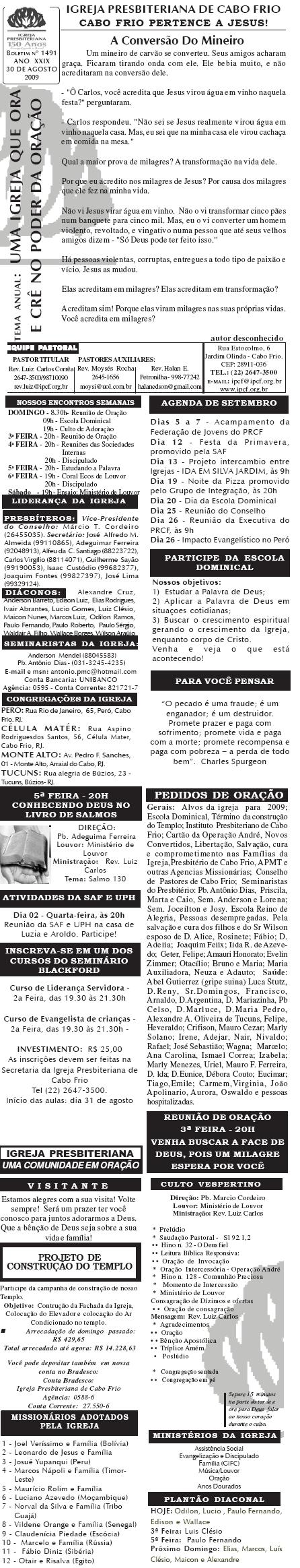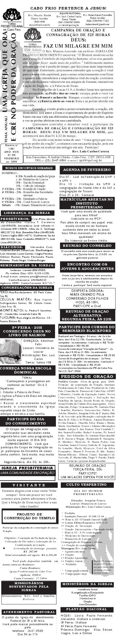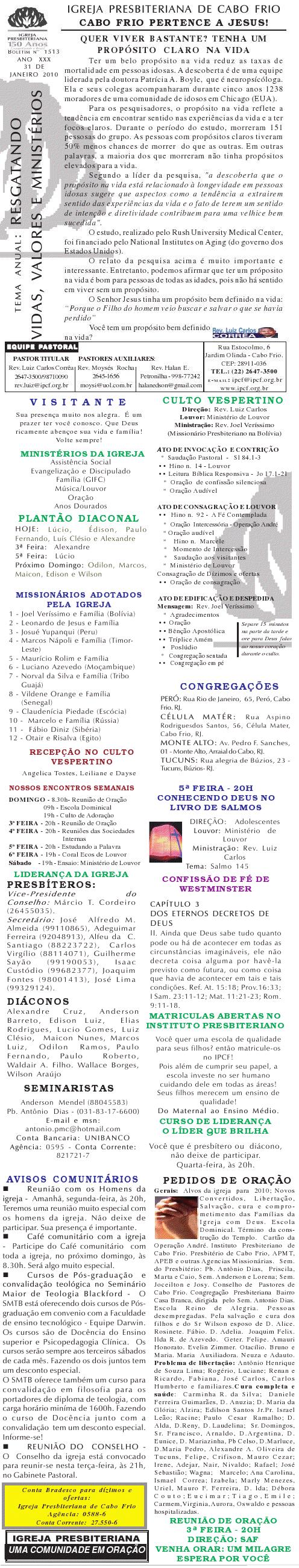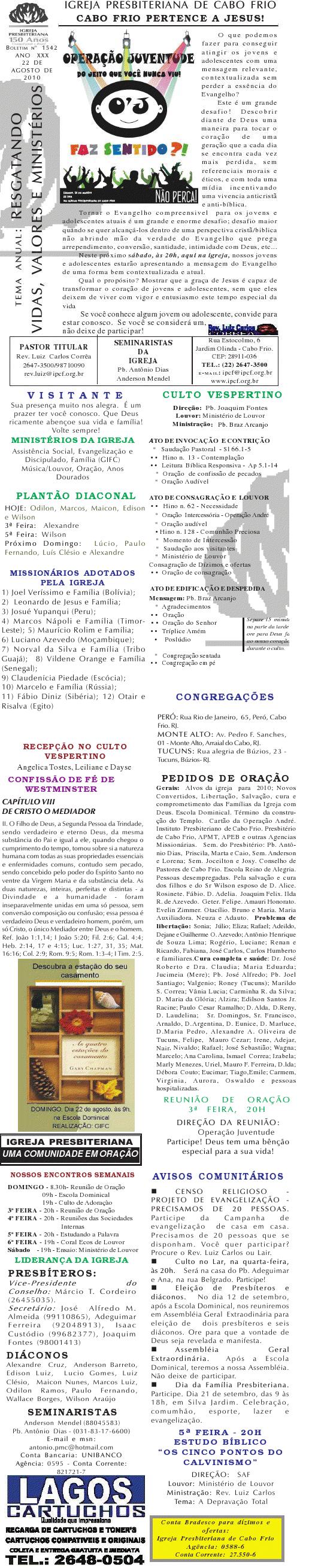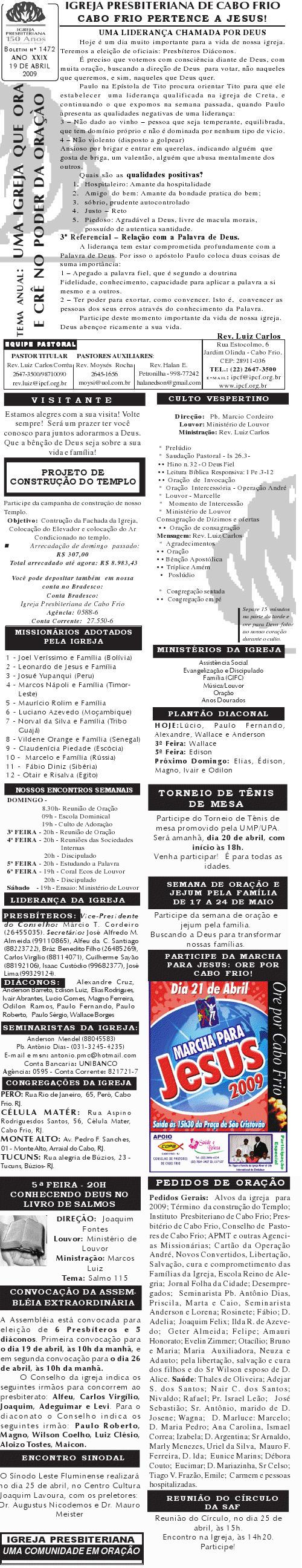 Querido (a), Estamos enviando mais um boletim de domingo ( 15/08/2010) : Lembrando: 1) No domingo teremos o nosso almoço missionário. vamos juntar as panelas e comidas. Se você quiser estar conosco, será um prazer. Traga a sua comida e vamos juntos nos alegrar e contribuir para missões; 2) No culto vespertino, receberemos alguns novos membros por profissão de fé e batismo, batismo infantil e jurisdição a pedido. venha participar deste momento importante na vida de nossa igreja. Desejamos a você e sua família um domingo muito abençoado. Abraços Rev. Luiz Carlos 20/08/2010 Querido (a), Estamos enviando o nosso boletim de domingo, lembrando: 1) Por ocasião de nossa Escola Dominical neste domingo, teremos um trabalho especial com casais promovido pelo Grupo de Integração da Família Cristã. Será um estudo sobre as quatro estações do casamento. Se você quiser saber qual é a estação do seu casamento, compareça. Será às 9h. 2) No próximo sábado, dia 28, às 20h, os nossos jovens e adolescentes realizarão uma programação muito especial voltada para jovens e adolescentes. O Tema é OPERAÇÃO JUVENTUDE. Será muito especial e diferente. Se você é jovem ou adolescentes ou se considera com tal, venha participar. No mais, desejamos um final de semana repleto das bênçãos divinas para você e sua família. Abraços Rev. Luiz Carlos Querido (a), Estamos enviando mais um boletim de domingo, lembrando: 1) neste sábado, se você abrir até sabado de tarde, teremos uma programação muito especial para jovens e adolescente em nossa igreja. Será às 20h. 2) queremos pedir a sua ajuda em oração para o pai do Rev. Edison Aguiar, que também se chama Edison Aguiar. O estado dele é grave, pois temos 06 veias que irrigam nosso coração, e ele está com 04 entupidas. Foi feito um cataterismo na aorta, e foi feito um dilatamento, pois ele se ressentiu muito do exame, e o sucesso foi pequeno. 3) externamos a nossa graditão por sua oração pelo missionário Dagnaldo que tinha sido preso no Egito e estava desaparecido. Graças a Deus ele foi localizado e já foi deportado para o Brasil. No mais, desejamos um final de semana ricamente abençoado por Deus para você e sua familia. E passando por Cabo Frio, nos faça uma visita. Abraços Rev. Luiz Carlos Querido (a). Estamos enviando o nosso boletim de domingo. Lembrando: 1) Não esqueça do nosso delicioso café da manhã, neste domingo, às 8.30h. 2) No dia 18 de setembro, teremos o nosso dia da família presbiteriana com todas as igrejas do Presbitério em Silva Jardim. Participe conosco! Queremos desejar um final de semana muito abençoado para você e sua família. Abraços Rev. Luiz Carlos Correa Querido (a), Segue o nosso boletim de domingo, desejando um final de semana muito abençoado por Deus para você e sua família. Estamos enviando um cartaz. Ainda não é o cartaz definitiivo, sobre o projeto missionário Chile, que acontecerá dos dias 5 a 27 de janeiro de 2011, em parceria com a Iglesia Presbiteriana "Cristo Mi Pastor". Mais uma vez Deus abençoe abundantemente a sua vida e familia. Abraços rev. Luiz Carlos