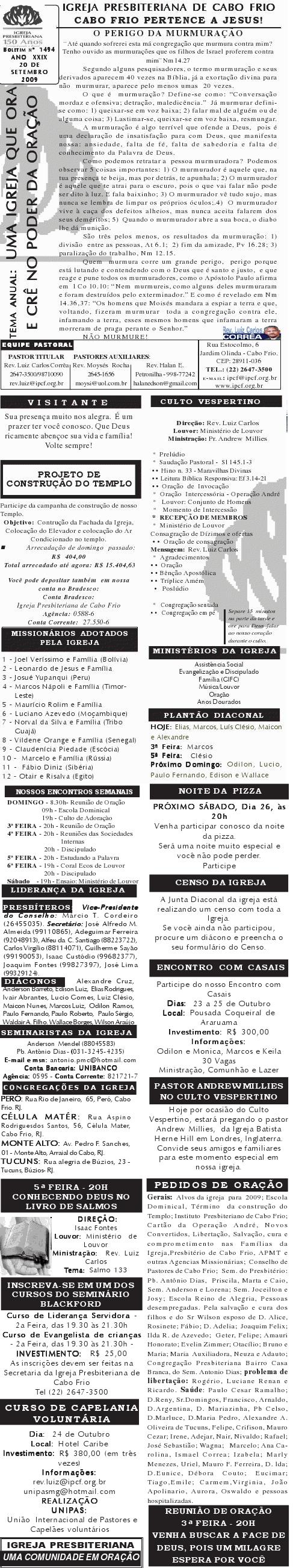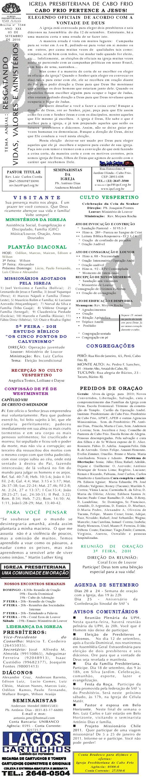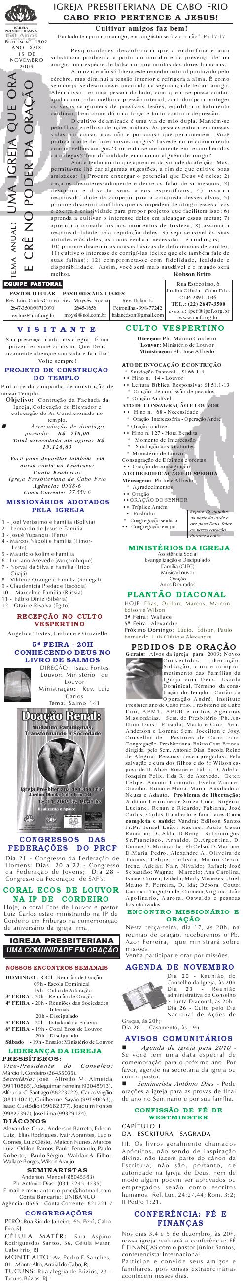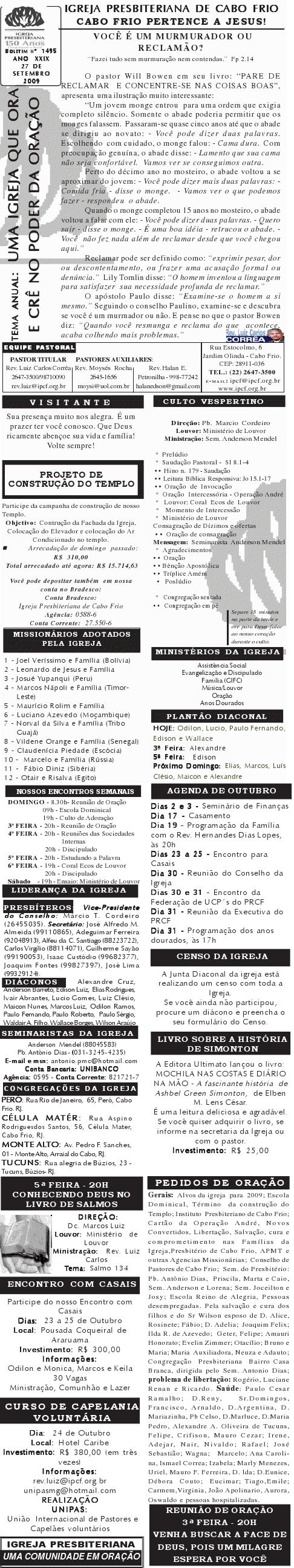 Querido (a), Estamos enviando mais um boletim de domingo ( 15/08/2010) : Lembrando: 1) No domingo teremos o nosso almoço missionário. vamos juntar as panelas e comidas. Se você quiser estar conosco, será um prazer. Traga a sua comida e vamos juntos nos alegrar e contribuir para missões; 2) No culto vespertino, receberemos alguns novos membros por profissão de fé e batismo, batismo infantil e jurisdição a pedido. venha participar deste momento importante na vida de nossa igreja. Desejamos a você e sua família um domingo muito abençoado. Abraços Rev. Luiz Carlos 20/08/2010 Querido (a), Estamos enviando o nosso boletim de domingo, lembrando: 1) Por ocasião de nossa Escola Dominical neste domingo, teremos um trabalho especial com casais promovido pelo Grupo de Integração da Família Cristã. Será um estudo sobre as quatro estações do casamento. Se você quiser saber qual é a estação do seu casamento, compareça. Será às 9h. 2) No próximo sábado, dia 28, às 20h, os nossos jovens e adolescentes realizarão uma programação muito especial voltada para jovens e adolescentes. O Tema é OPERAÇÃO JUVENTUDE. Será muito especial e diferente. Se você é jovem ou adolescentes ou se considera com tal, venha participar. No mais, desejamos um final de semana repleto das bênçãos divinas para você e sua família. Abraços Rev. Luiz Carlos Querido (a), Estamos enviando mais um boletim de domingo, lembrando: 1) neste sábado, se você abrir até sabado de tarde, teremos uma programação muito especial para jovens e adolescente em nossa igreja. Será às 20h. 2) queremos pedir a sua ajuda em oração para o pai do Rev. Edison Aguiar, que também se chama Edison Aguiar. O estado dele é grave, pois temos 06 veias que irrigam nosso coração, e ele está com 04 entupidas. Foi feito um cataterismo na aorta, e foi feito um dilatamento, pois ele se ressentiu muito do exame, e o sucesso foi pequeno. 3) externamos a nossa graditão por sua oração pelo missionário Dagnaldo que tinha sido preso no Egito e estava desaparecido. Graças a Deus ele foi localizado e já foi deportado para o Brasil. No mais, desejamos um final de semana ricamente abençoado por Deus para você e sua familia. E passando por Cabo Frio, nos faça uma visita. Abraços Rev. Luiz Carlos Querido (a). Estamos enviando o nosso boletim de domingo. Lembrando: 1) Não esqueça do nosso delicioso café da manhã, neste domingo, às 8.30h. 2) No dia 18 de setembro, teremos o nosso dia da família presbiteriana com todas as igrejas do Presbitério em Silva Jardim. Participe conosco! Queremos desejar um final de semana muito abençoado para você e sua família. Abraços Rev. Luiz Carlos Correa Querido (a), Segue o nosso boletim de domingo, desejando um final de semana muito abençoado por Deus para você e sua família. Estamos enviando um cartaz. Ainda não é o cartaz definitiivo, sobre o projeto missionário Chile, que acontecerá dos dias 5 a 27 de janeiro de 2011, em parceria com a Iglesia Presbiteriana "Cristo Mi Pastor". Mais uma vez Deus abençoe abundantemente a sua vida e familia. Abraços rev. Luiz Carlos