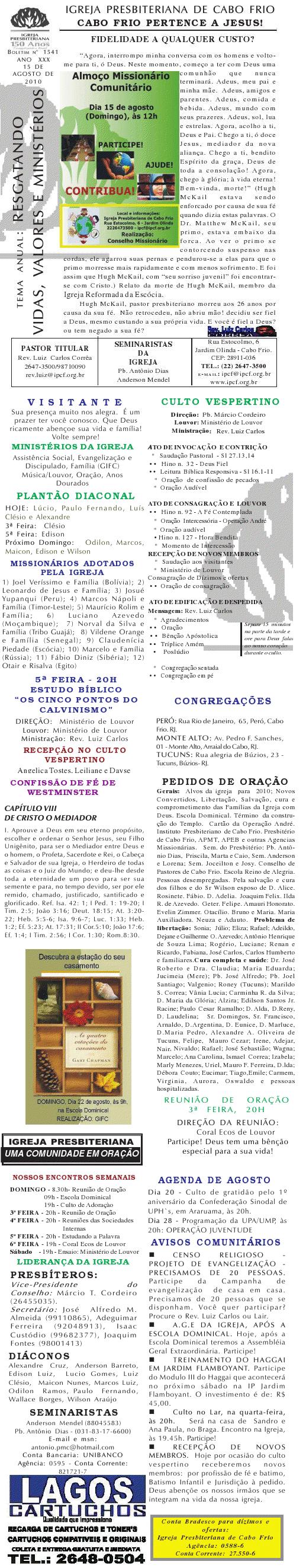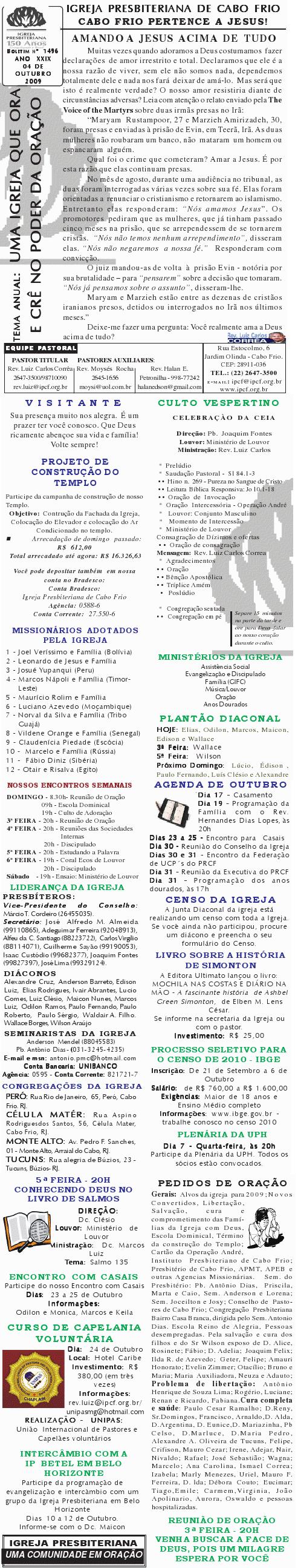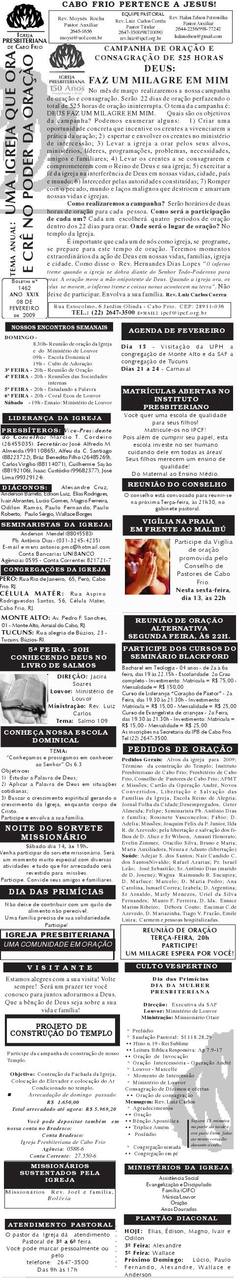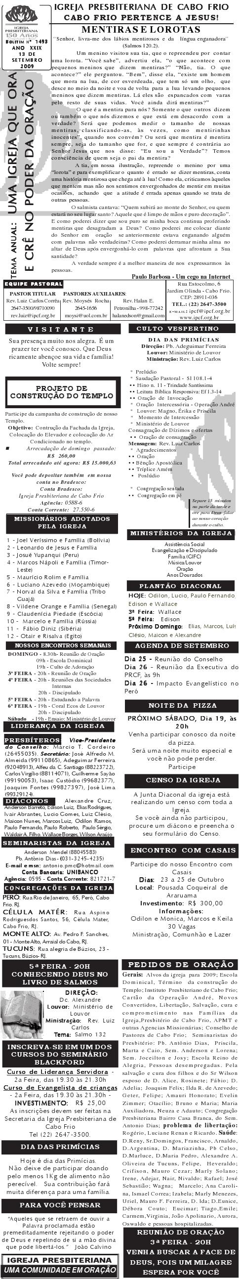 Querido (a), Estamos enviando mais um boletim de domingo ( 15/08/2010) : Lembrando: 1) No domingo teremos o nosso almoço missionário. vamos juntar as panelas e comidas. Se você quiser estar conosco, será um prazer. Traga a sua comida e vamos juntos nos alegrar e contribuir para missões; 2) No culto vespertino, receberemos alguns novos membros por profissão de fé e batismo, batismo infantil e jurisdição a pedido. venha participar deste momento importante na vida de nossa igreja. Desejamos a você e sua família um domingo muito abençoado. Abraços Rev. Luiz Carlos 20/08/2010 Querido (a), Estamos enviando o nosso boletim de domingo, lembrando: 1) Por ocasião de nossa Escola Dominical neste domingo, teremos um trabalho especial com casais promovido pelo Grupo de Integração da Família Cristã. Será um estudo sobre as quatro estações do casamento. Se você quiser saber qual é a estação do seu casamento, compareça. Será às 9h. 2) No próximo sábado, dia 28, às 20h, os nossos jovens e adolescentes realizarão uma programação muito especial voltada para jovens e adolescentes. O Tema é OPERAÇÃO JUVENTUDE. Será muito especial e diferente. Se você é jovem ou adolescentes ou se considera com tal, venha participar. No mais, desejamos um final de semana repleto das bênçãos divinas para você e sua família. Abraços Rev. Luiz Carlos Querido (a), Estamos enviando mais um boletim de domingo, lembrando: 1) neste sábado, se você abrir até sabado de tarde, teremos uma programação muito especial para jovens e adolescente em nossa igreja. Será às 20h. 2) queremos pedir a sua ajuda em oração para o pai do Rev. Edison Aguiar, que também se chama Edison Aguiar. O estado dele é grave, pois temos 06 veias que irrigam nosso coração, e ele está com 04 entupidas. Foi feito um cataterismo na aorta, e foi feito um dilatamento, pois ele se ressentiu muito do exame, e o sucesso foi pequeno. 3) externamos a nossa graditão por sua oração pelo missionário Dagnaldo que tinha sido preso no Egito e estava desaparecido. Graças a Deus ele foi localizado e já foi deportado para o Brasil. No mais, desejamos um final de semana ricamente abençoado por Deus para você e sua familia. E passando por Cabo Frio, nos faça uma visita. Abraços Rev. Luiz Carlos Querido (a). Estamos enviando o nosso boletim de domingo. Lembrando: 1) Não esqueça do nosso delicioso café da manhã, neste domingo, às 8.30h. 2) No dia 18 de setembro, teremos o nosso dia da família presbiteriana com todas as igrejas do Presbitério em Silva Jardim. Participe conosco! Queremos desejar um final de semana muito abençoado para você e sua família. Abraços Rev. Luiz Carlos Correa Querido (a), Segue o nosso boletim de domingo, desejando um final de semana muito abençoado por Deus para você e sua família. Estamos enviando um cartaz. Ainda não é o cartaz definitiivo, sobre o projeto missionário Chile, que acontecerá dos dias 5 a 27 de janeiro de 2011, em parceria com a Iglesia Presbiteriana "Cristo Mi Pastor". Mais uma vez Deus abençoe abundantemente a sua vida e familia. Abraços rev. Luiz Carlos