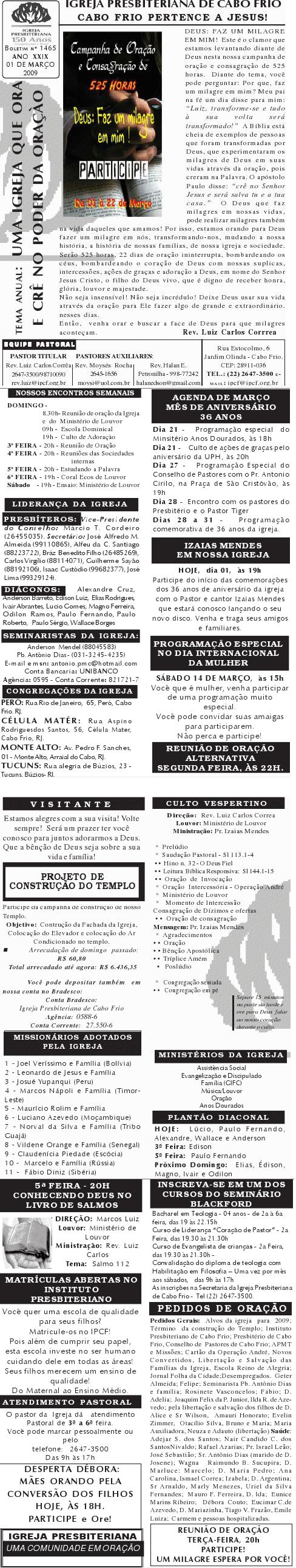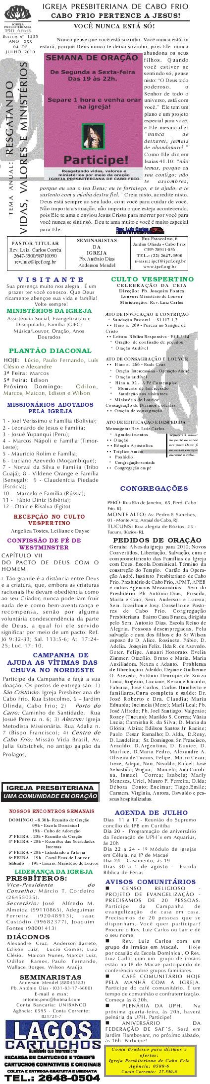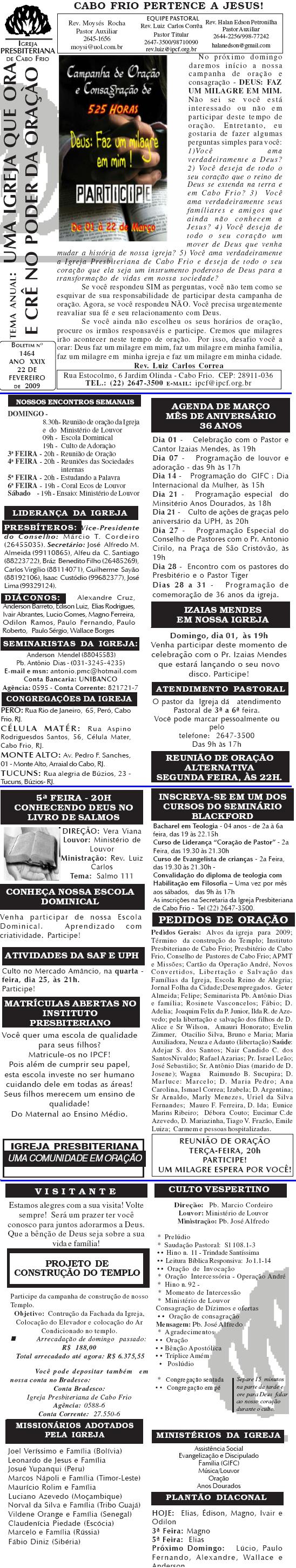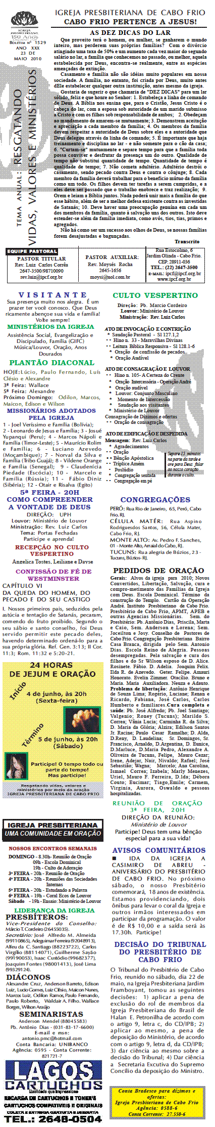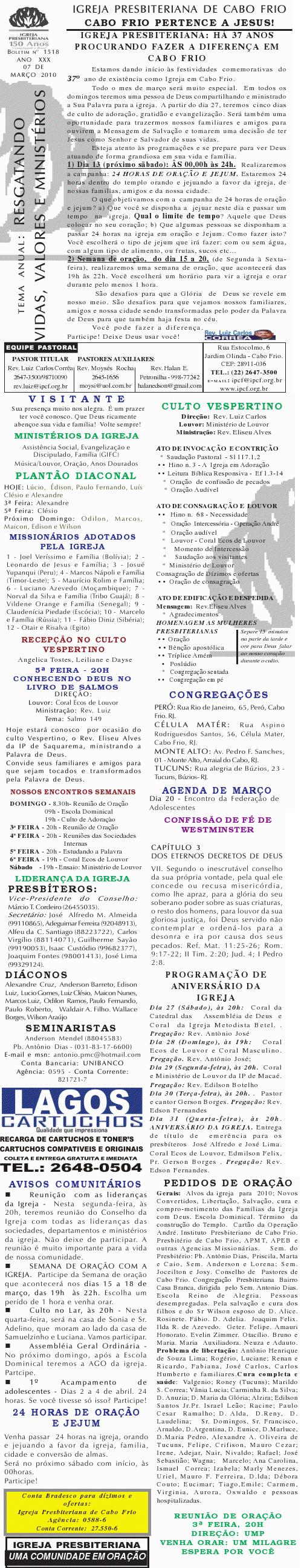Estamos enviando o nosso boletim de domingo. Queremos lembrar algumas: 1) O Conselho de Pastore de Cabo Frio, juntamente a UNIPAS BRASIL, na região dos Lagos, está desenvolvendo uma campanha para arrecadação de material para enviar para os necessitados, vitimas das últimas chuvas no rio de Janeiro. Se você puder ajudar, contribuir ou souber quem pode, faça contato conosco. O material pode ser enviado para Missão Vida Brasil, situada na Av. Julia Kubstchek, no antigo galpão da prologos. Quando arrecarmos o suficente, enviaremos o material. Participe e divulgue. 2) Ore pela situação tragica que está passando o Rio de Janeiro no moment. Ore pela familia do Pastor Sergio, de Niteroi perdeu a irma, a cunhada e um sobrinhode um ano, a crianca ainda nao foi encontrada sobre a lama.. Quero desejar um domingo muito abençoado por Deus para a você e sua família. Abraços Rev. Luiz Carlos