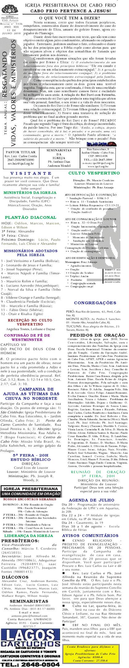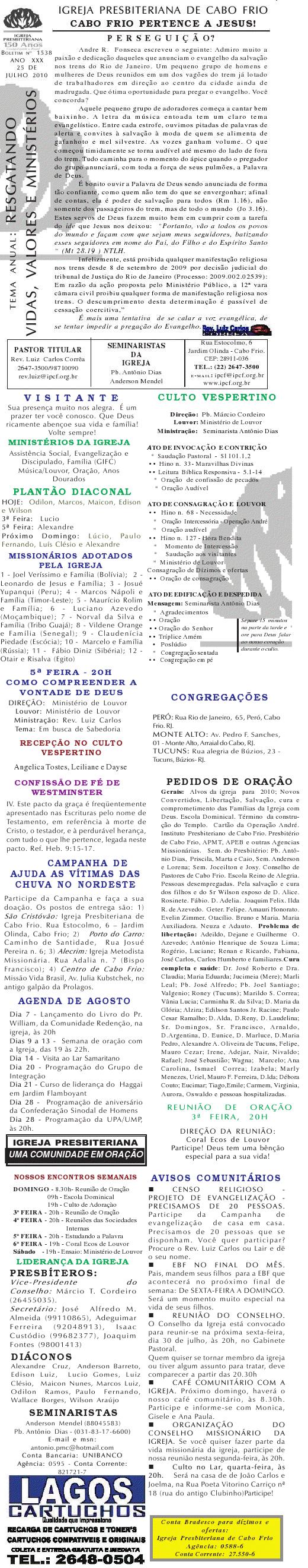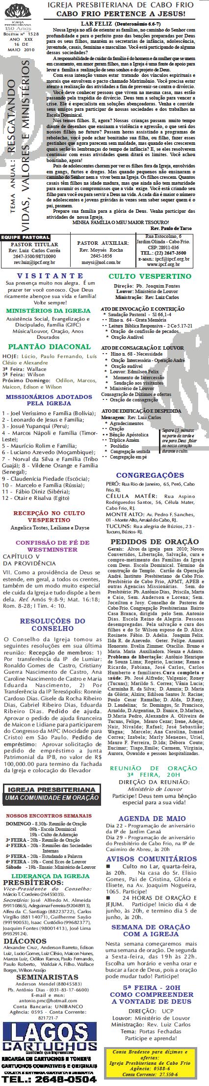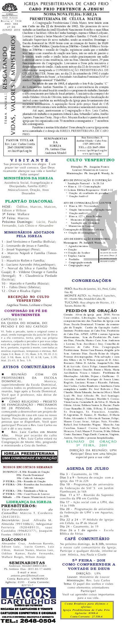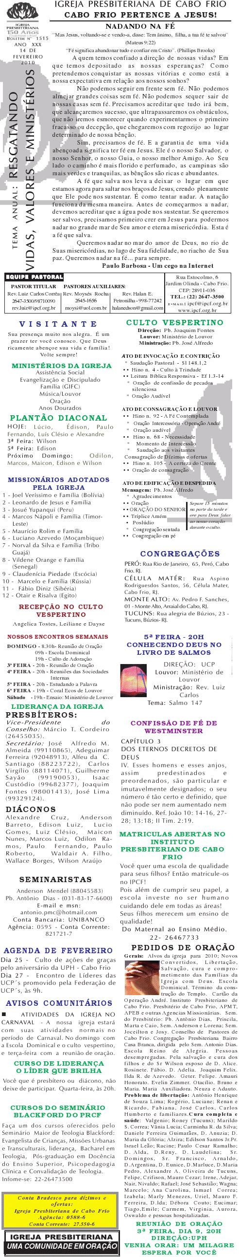 Estamos enviando o nosso boletim de domingo. Queremos lembrar algumas: 1) O Conselho de Pastore de Cabo Frio, juntamente a UNIPAS BRASIL, na região dos Lagos, está desenvolvendo uma campanha para arrecadação de material para enviar para os necessitados, vitimas das últimas chuvas no rio de Janeiro. Se você puder ajudar, contribuir ou souber quem pode, faça contato conosco. O material pode ser enviado para Missão Vida Brasil, situada na Av. Julia Kubstchek, no antigo galpão da prologos. Quando arrecarmos o suficente, enviaremos o material. Participe e divulgue. 2) Ore pela situação tragica que está passando o Rio de Janeiro no moment. Ore pela familia do Pastor Sergio, de Niteroi perdeu a irma, a cunhada e um sobrinhode um ano, a crianca ainda nao foi encontrada sobre a lama.. Quero desejar um domingo muito abençoado por Deus para a você e sua família. Abraços Rev. Luiz Carlos