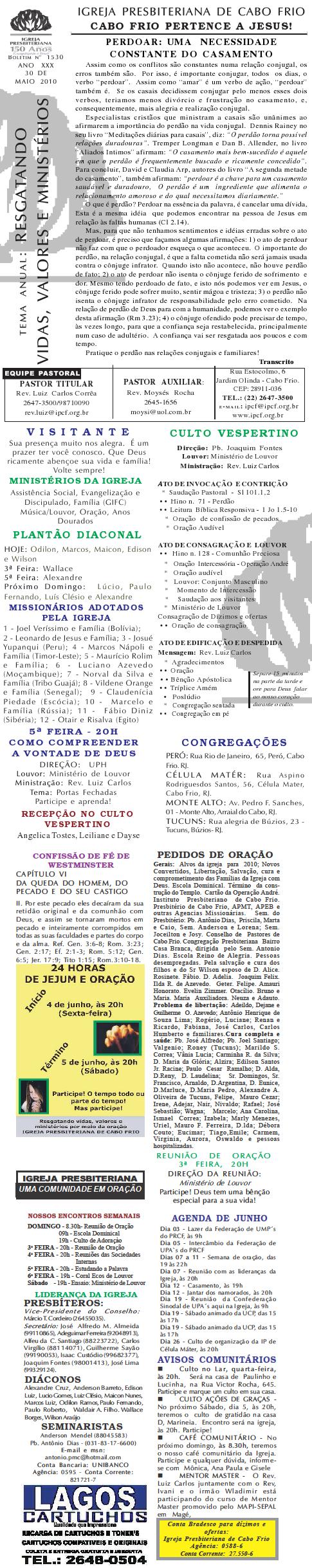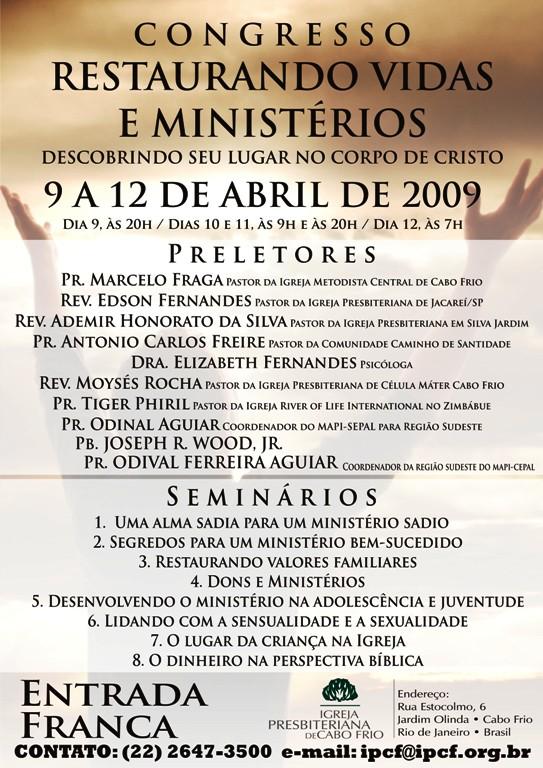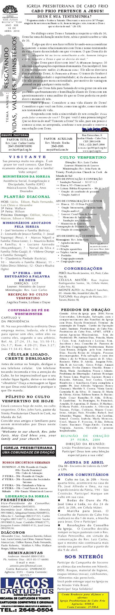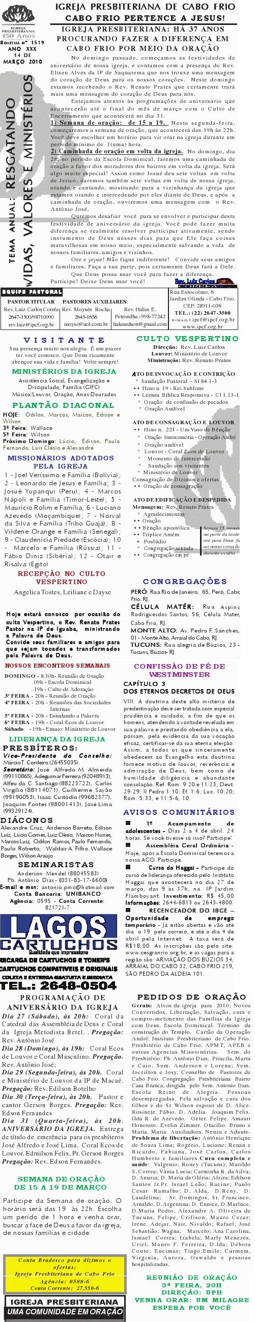 Queremos lembrar o encontro do pastoreio de pastores, que acontecerá na próxima segunda-feira, às 9h, na Igreja Presbiteriana de Cabo Frio, na rua Estocolmo, 6. com o pastor Odinal Aguiar, coordenador do MAPI-SEPAL para a região sudeste. Esses encontros tem sido algo muito edificante para a vida dos pastores que tem participado. Venha participar e nos ajude divulgando para outros colegas. abraços Rev. Luiz Sec. COPACABOFRIO 17/04/2010 Querido (a), Estamos enviando o nosso boletim de domingo. Lembramos: 1) Neste domingo estamos recebendo o Rev. ohn Faris, pastor da Trinity Presbyterian Church in Cork, na Irlanda do Sul. Um homem de Deus que estará compartilhando conosco as verdades divinas por ocasião do nosso culto vespertino. Venha participar com sua família; 2) Estamos junto com o Conselho de Pastores realizando a campanha: SOS NITERÓI, para socorrer aqueles que foram vítimas das últimas chuvas. Você pode trazer sua doação aqui para a Igreja ou para a Missão Vida Brasil. Queremos desejar a você e sua família, um final de semana muito abençoado e enriquecidos com as muitas e maravilhosas bênçãos de Deus. Abraços Rev. Luiz Carlos