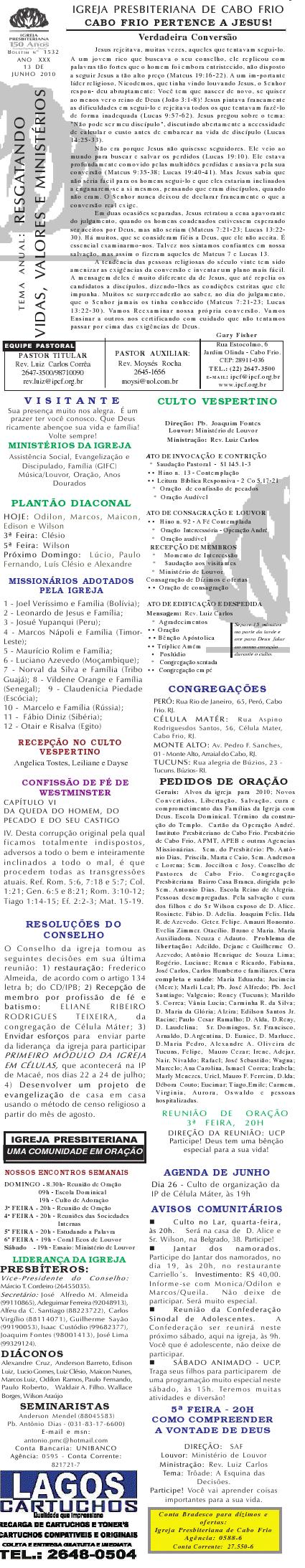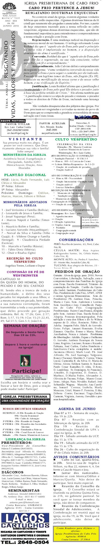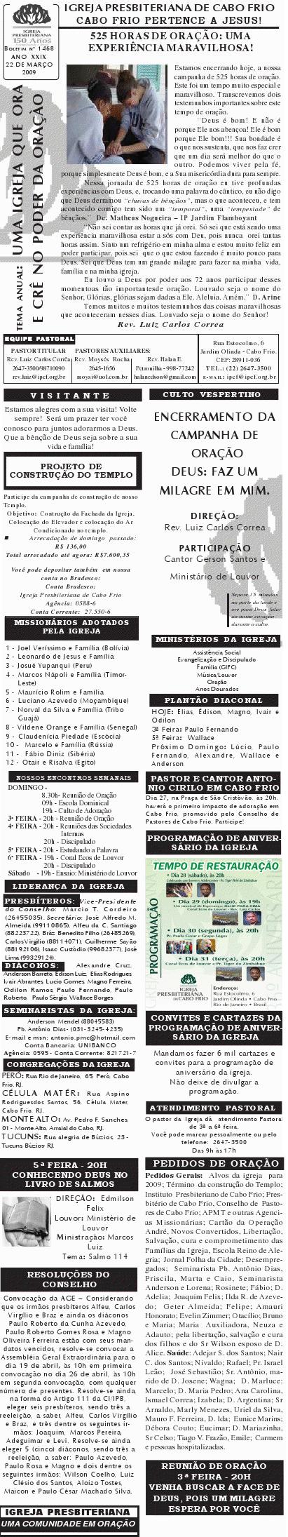 Queremos lembrar o encontro do pastoreio de pastores, que acontecerá na próxima segunda-feira, às 9h, na Igreja Presbiteriana de Cabo Frio, na rua Estocolmo, 6. com o pastor Odinal Aguiar, coordenador do MAPI-SEPAL para a região sudeste. Esses encontros tem sido algo muito edificante para a vida dos pastores que tem participado. Venha participar e nos ajude divulgando para outros colegas. abraços Rev. Luiz Sec. COPACABOFRIO 17/04/2010 Querido (a), Estamos enviando o nosso boletim de domingo. Lembramos: 1) Neste domingo estamos recebendo o Rev. ohn Faris, pastor da Trinity Presbyterian Church in Cork, na Irlanda do Sul. Um homem de Deus que estará compartilhando conosco as verdades divinas por ocasião do nosso culto vespertino. Venha participar com sua família; 2) Estamos junto com o Conselho de Pastores realizando a campanha: SOS NITERÓI, para socorrer aqueles que foram vítimas das últimas chuvas. Você pode trazer sua doação aqui para a Igreja ou para a Missão Vida Brasil. Queremos desejar a você e sua família, um final de semana muito abençoado e enriquecidos com as muitas e maravilhosas bênçãos de Deus. Abraços Rev. Luiz Carlos