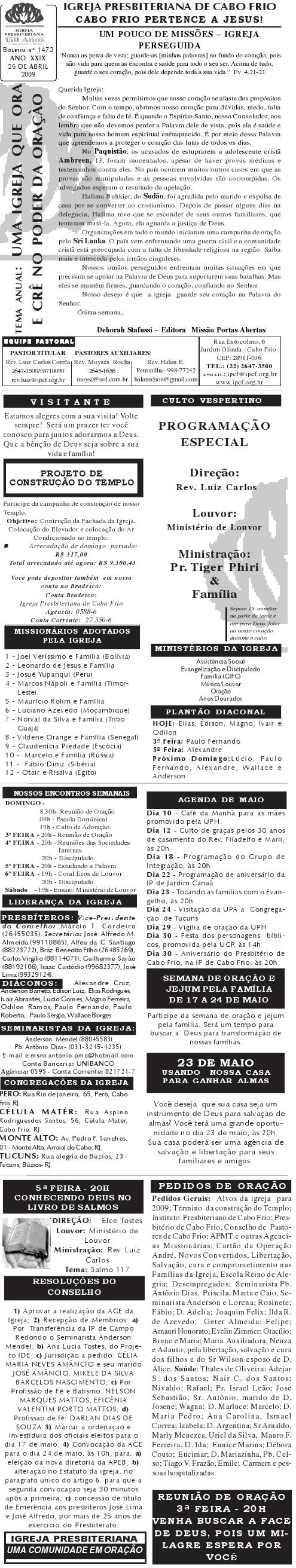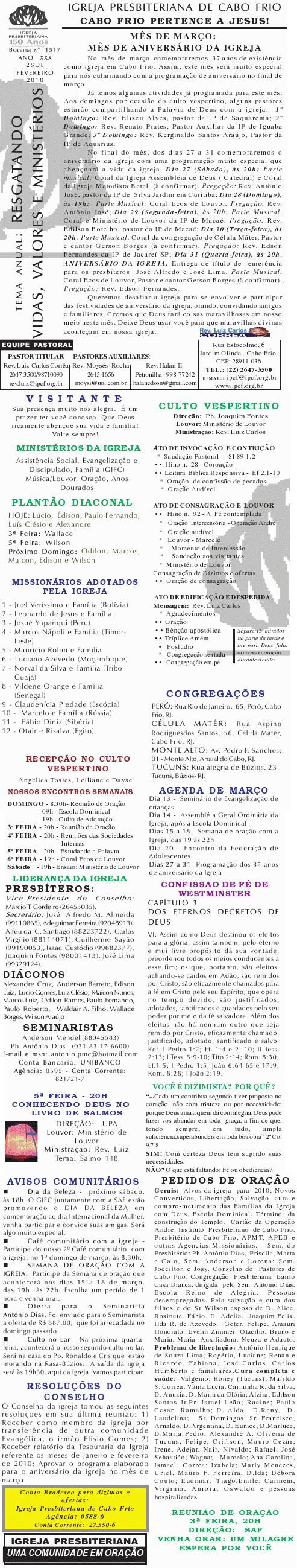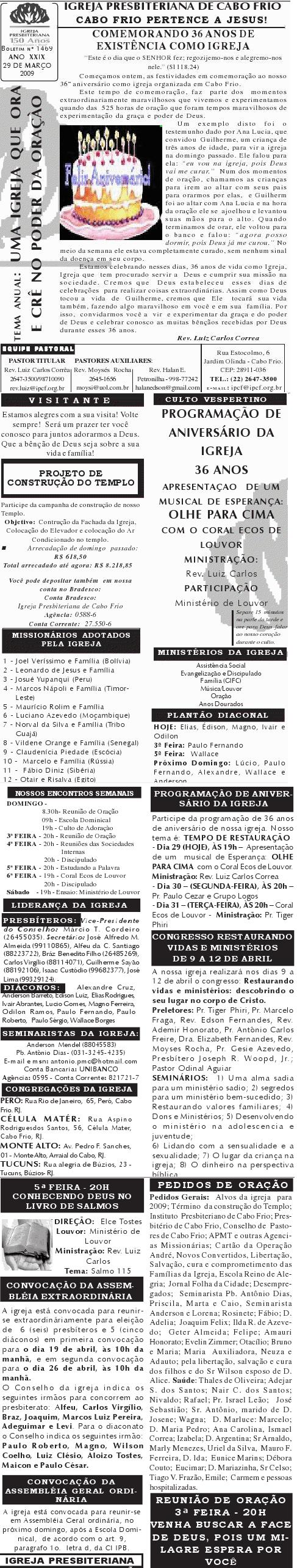 Presbiteriana de Cabo Frio, às 9h. Contaremos com a presença do Secretaria Municipal de Infância. Segue anexo carta com informações mais detalhadas. Abraços Rev. Luiz Carlos Presidente do Conselho