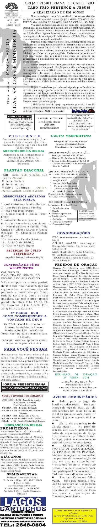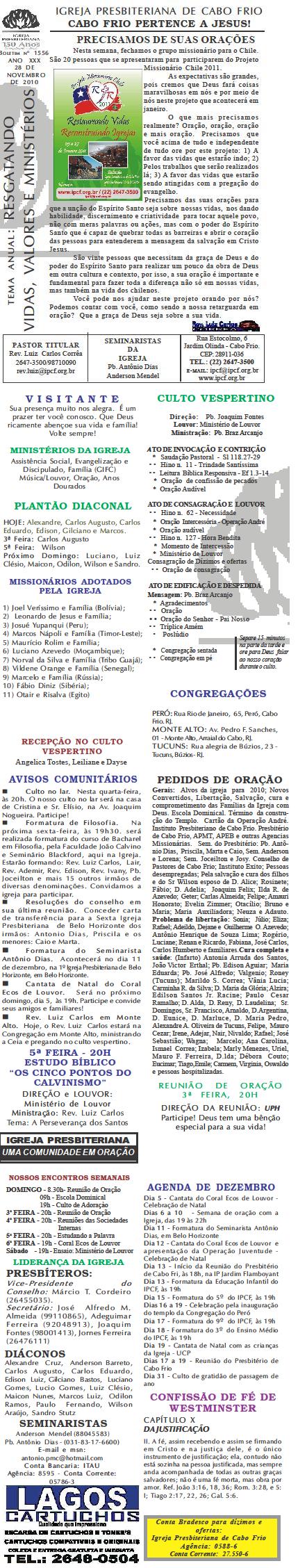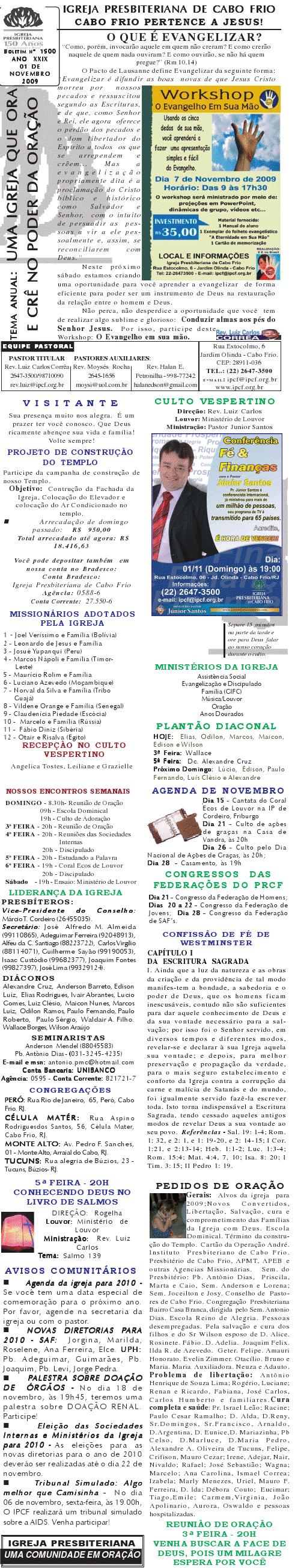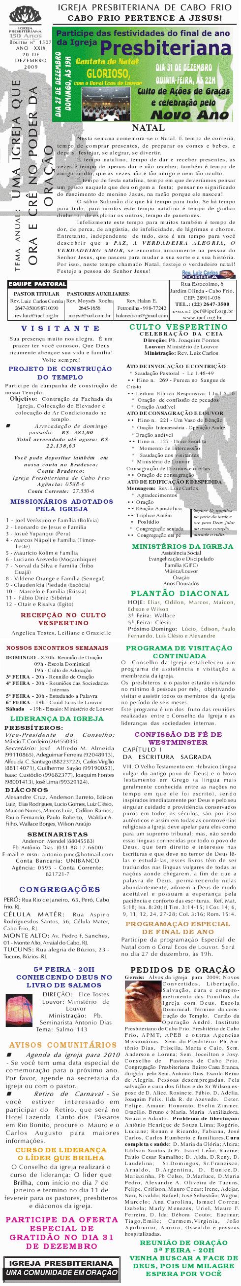 Segue o nosso boletim de domingo, lembrando: 1) Neste sábado, dia 27/11/2010 , às 20h, temos o nosso rodízio de pizza missionária. Venha participar e abençoar missões. 2) Não se esqueça de orar pelo nosso Estado do Rio de Janeiro para paz e a cidadania sejam estabelecidas. Desejamos a você sua família um final de semana muito abençoado com as mais ricas e maravilhosas bênçãos de Deus. Abraços Rev. Luiz Carlos Querido (a), Estamos enviando o nosso boletim de domingo. Lembrando que teremos mais uma audição do Coral Ecos de Louvor no domingo a noite e também uma apresentação do Ministério Operação Juventude com um drama muito especial sobre o natal. Você e sua família são nossos convidados. Queremos desejar a você e sua família um final de semana muito, mais muito abençoado mesmo. Abraços Rev. Luiz Carlos