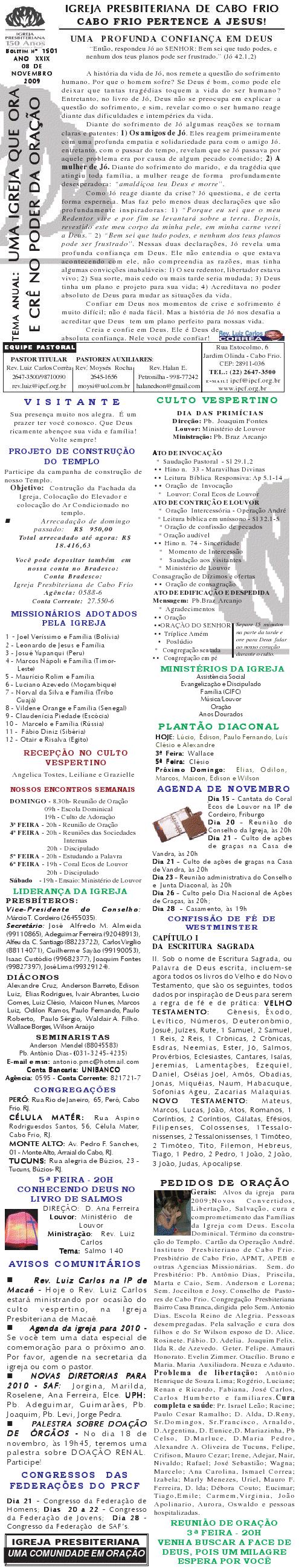Rev. Luiz Carlos Corrêa Pastor da Igreja Presidente do Presbitério de Cabo Frio rev.luiz@ipcf.org.br Rua Estocolmo, 6, Jardim Olinda, Cabo Frio - RJ CEP 28911-036 - Telefax (22) 2647-3500 Disque-Paz: 22-2647-2035 23/10/2010 _ Querido (a), Estamos enviando mais um boletim de domingo, desejando as mais ricas bênçãos de Deus para a sua vida e família. Por favor, passando por Cabo Frio, nos faça uma visita. Abraços Rev. Luiz Carlos Obs. divulgue o nosso projeto missionário Chile 2011.
