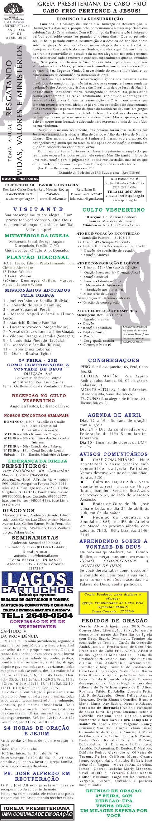 Querido (a), Estamos enviando nosso boletim ( nr. 1.522 ) de domingo. Desejamos um domingo muito abençoado para a sua vida e famiília. Abraços Rev. Luiz Carlos 04.04.10 Querido