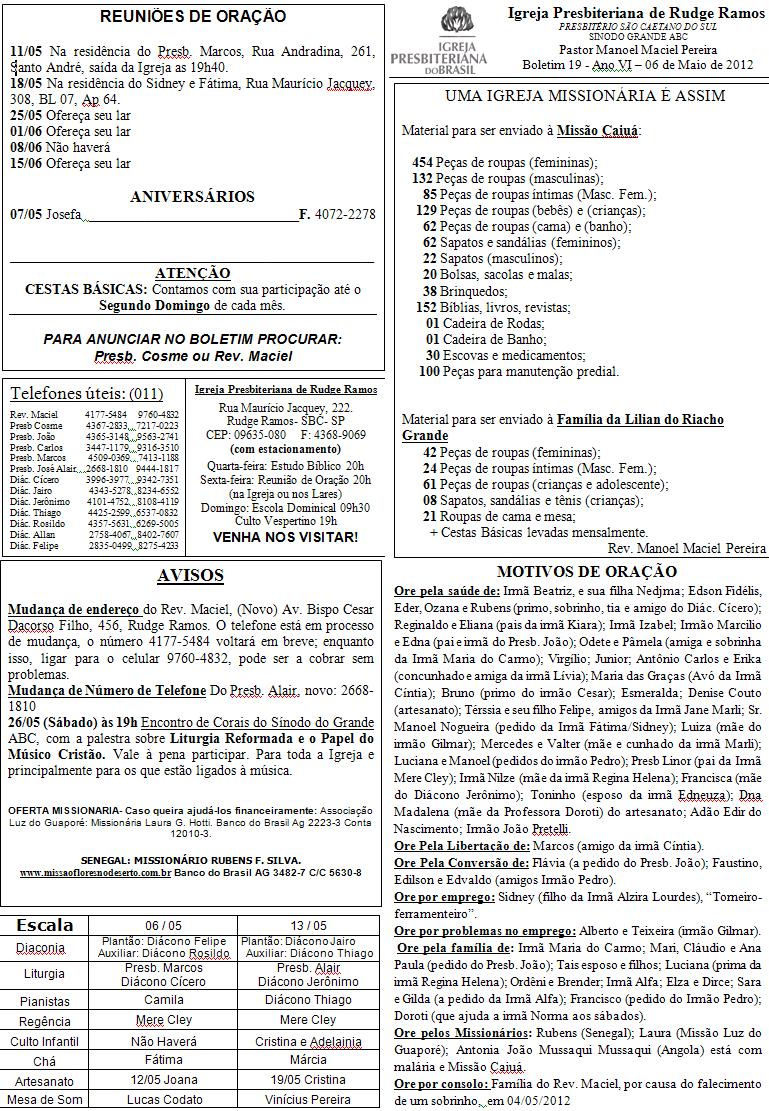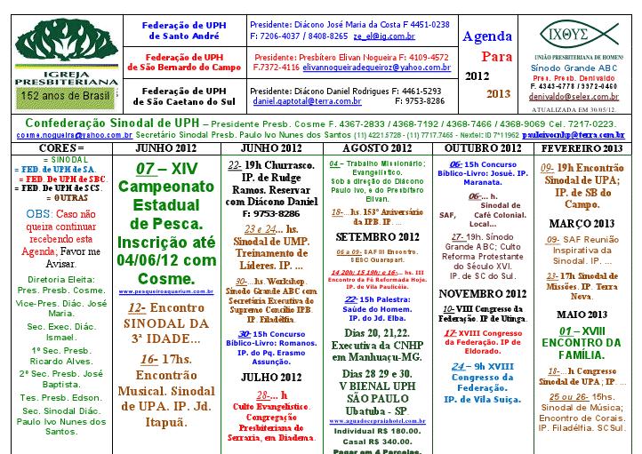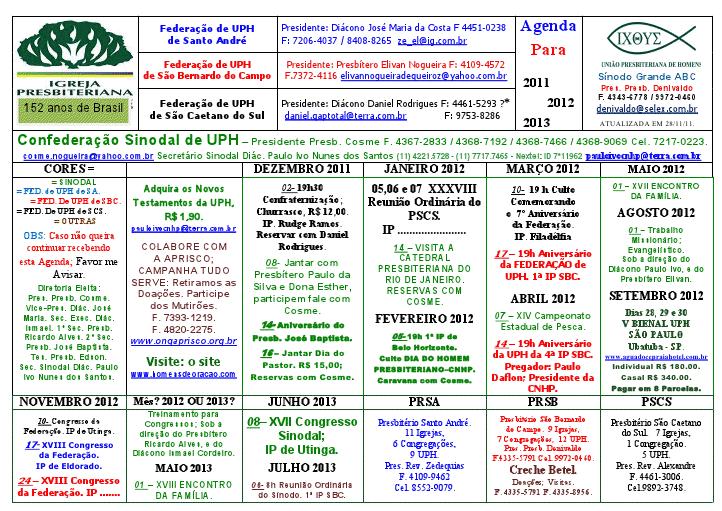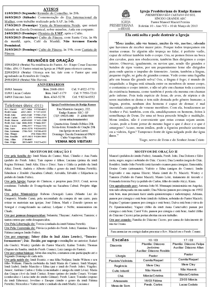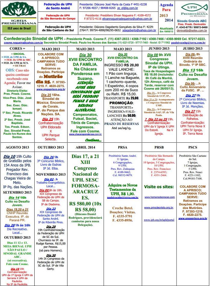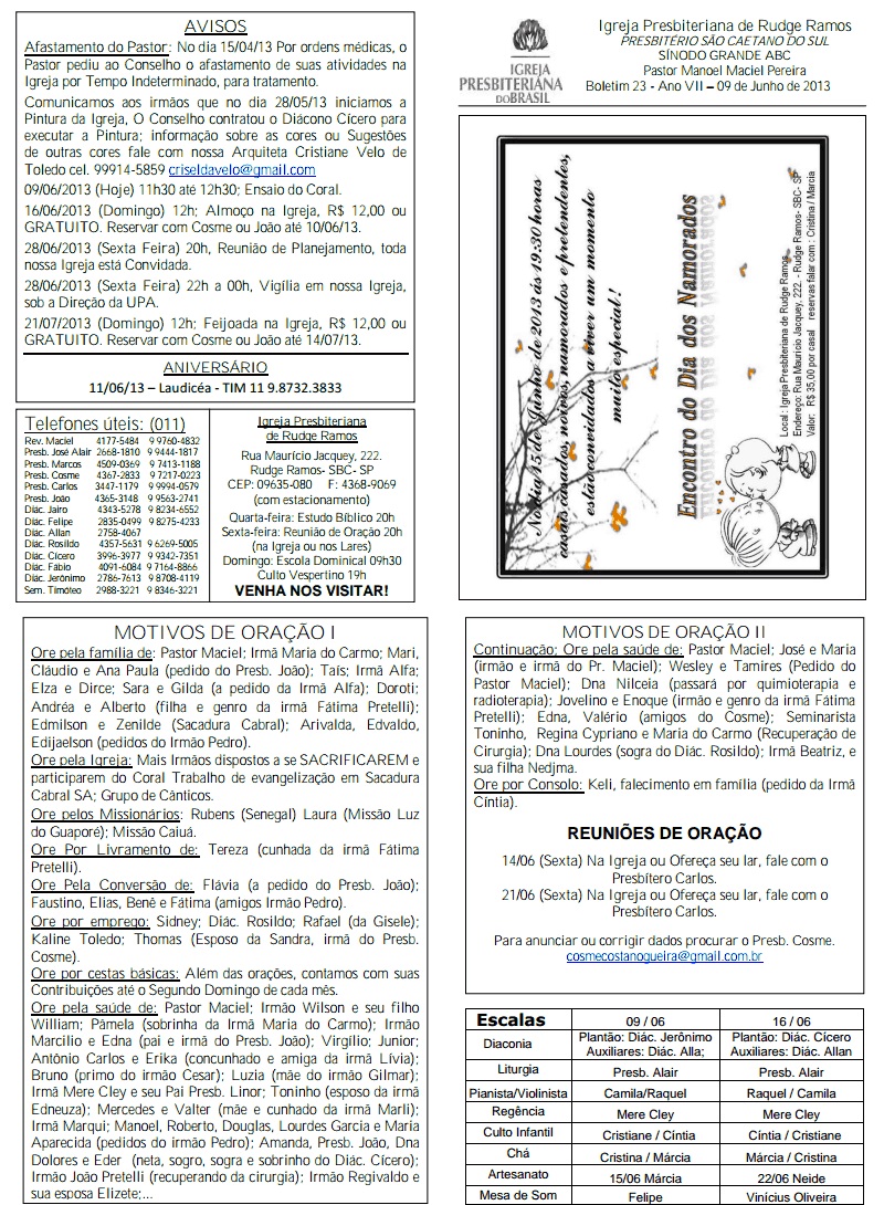 07/04/2013 (Domingo) Plenária da UPH, após o Culto. REUNIÕES DE ORAÇÃO 05,12e19/04/2013 (Sexta) Ofereça seu lar, fale com o Presb. Carlos. ANIVERSÁRIO
