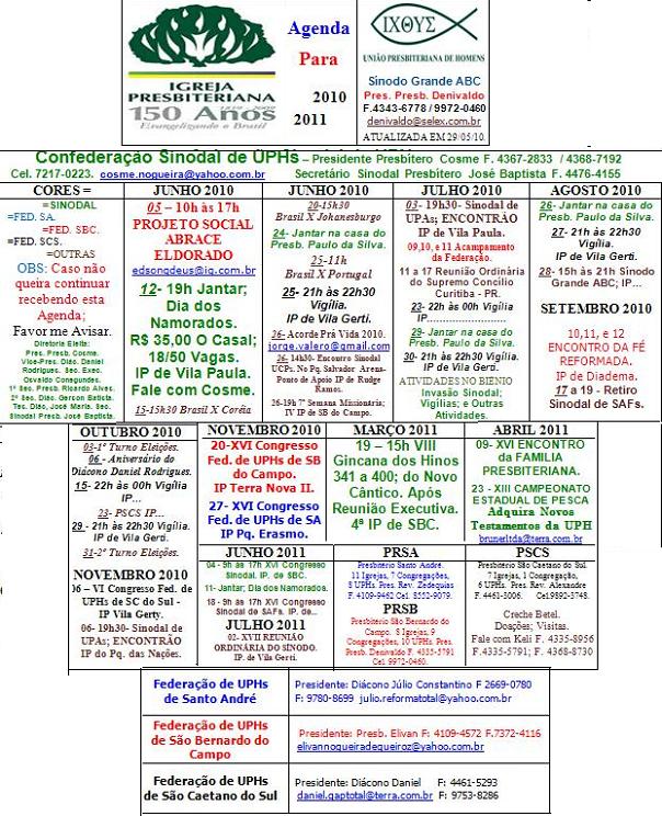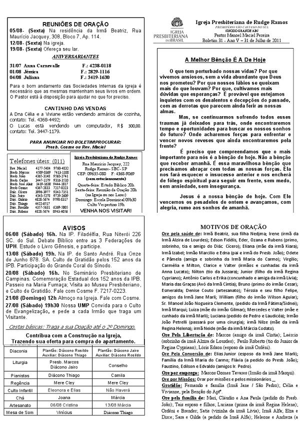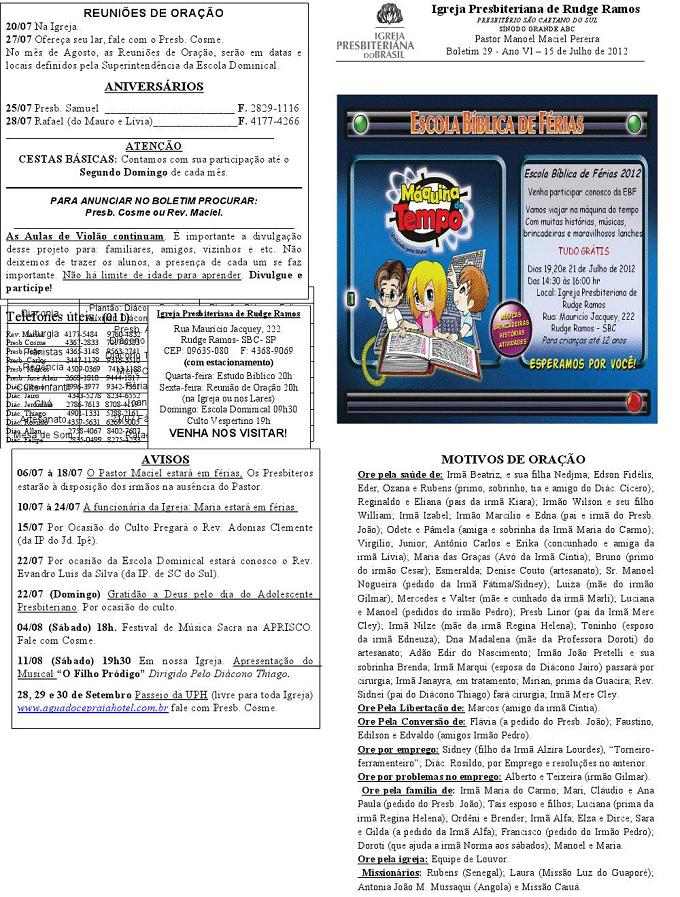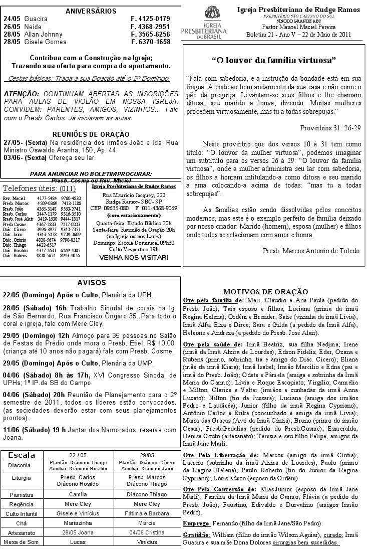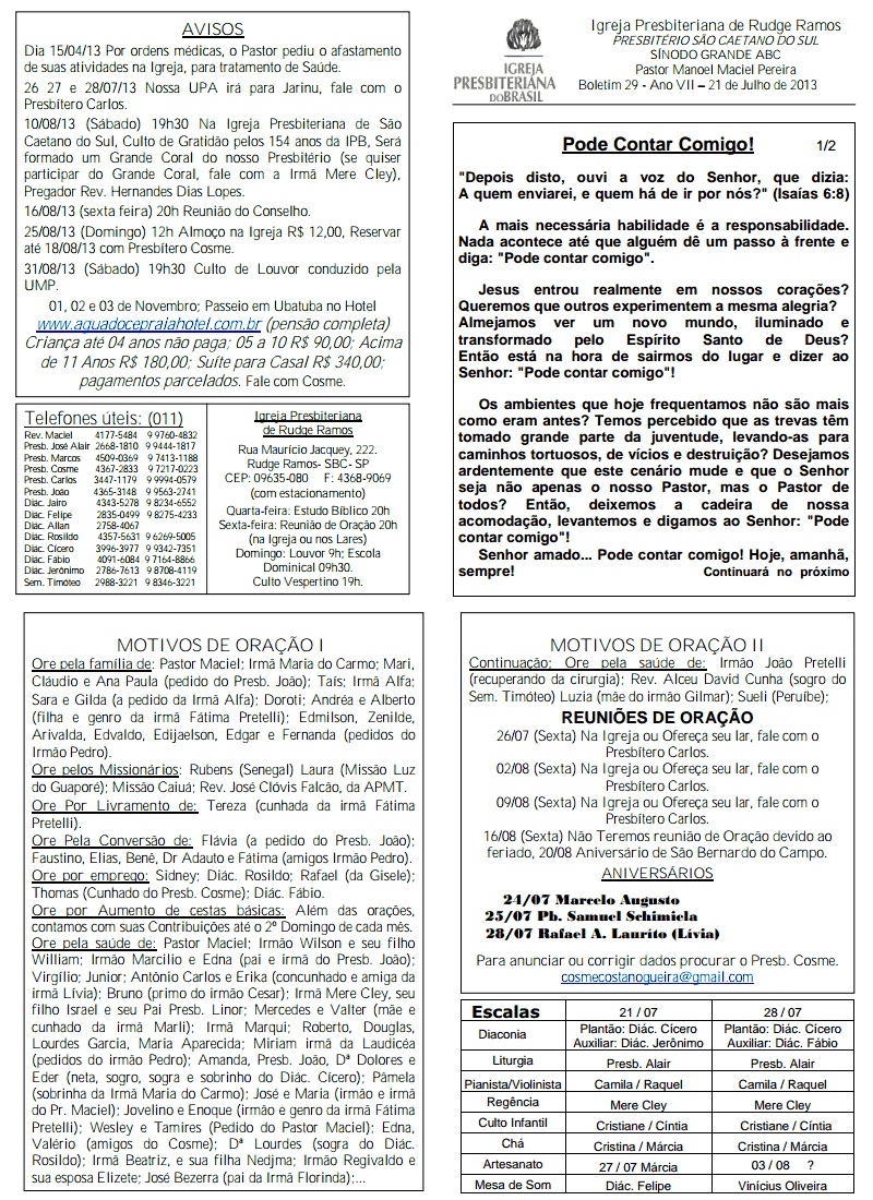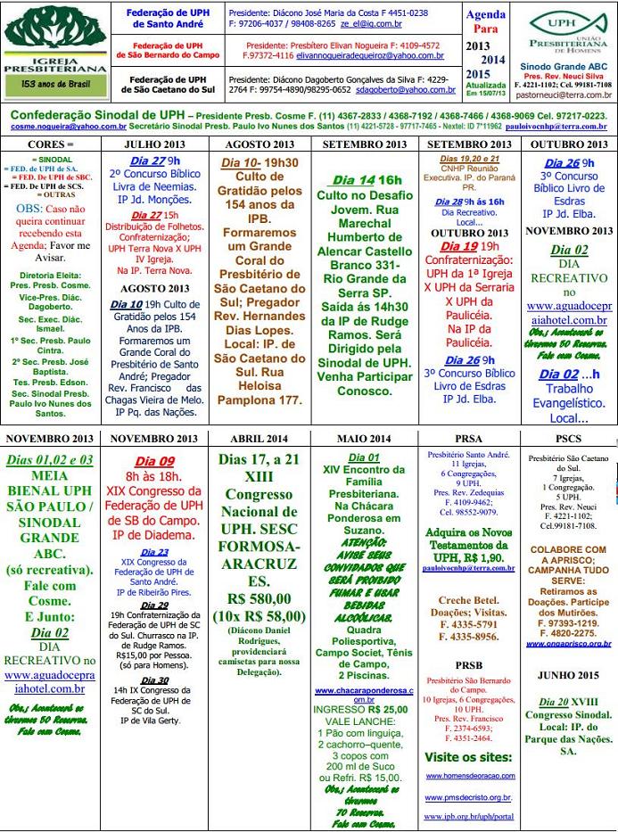 07/04/2013 (Domingo) Plenária da UPH, após o Culto. REUNIÕES DE ORAÇÃO 05,12e19/04/2013 (Sexta) Ofereça seu lar, fale com o Presb. Carlos. ANIVERSÁRIO