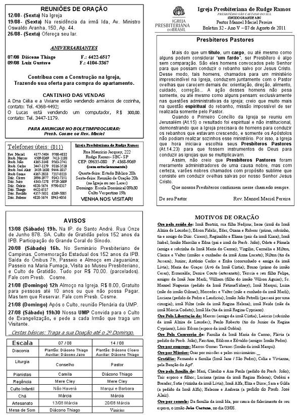 Presb. Marcos 4509-0369 7896-1561 Presb. João 4365-3148 9563-2741 Presb. Carlos 3447-1179 9316-3510 Presb. José Alair 9444-1817 7041-1808 Presb Cosme 4367-2833 7217-0223 Diác. Cícero 3996-3977 9342-7351 Diác. Jairo 4343-5278 Diác. Ozório 4828-5674 9790-8317 Diác. Thiago 4422-6517 7246-9746 Diác. Rosildo 4357-5631 8299-7313 Diác. Rubens 4828-5674 8943-4056 - - Igreja Presbiteriana de Rudge Ramos Rua