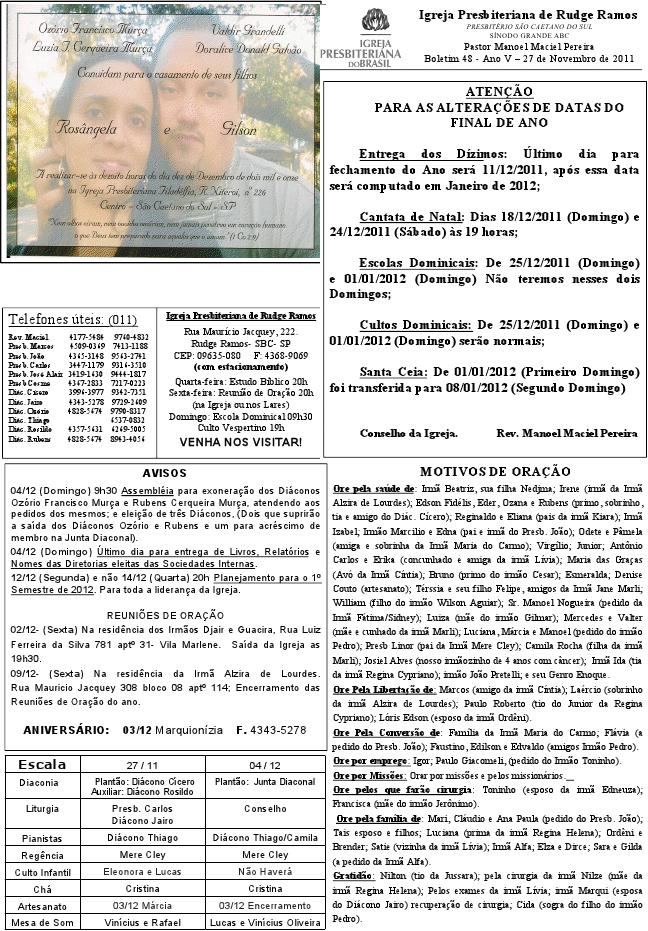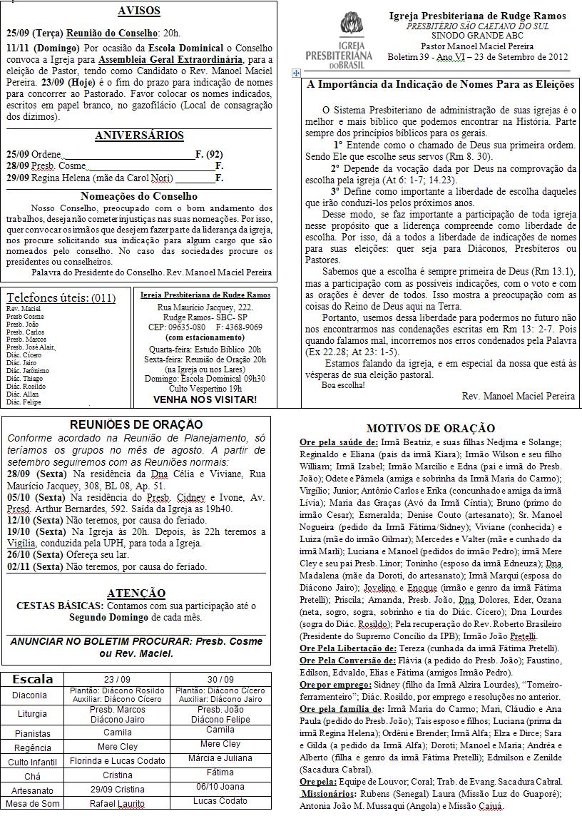 - - ATENÇÃO CESTAS BÁSICAS: Contamos com sua participação até o Segundo Domingo de cada mês. Para anunciar no Boletim procurar o Presb. Cosme. MOTIVOS DE ORAÇÃO Ore pela saúde de: Irmã Beatriz, e sua filha Nedjma; Irmão Wilson e seu filho William; Irmã Izabel; Irmão Marcilio e Edna (pai e irmã do Presb. João); Pâmela (sobrinha da Irmã Maria do Carmo); Virgílio; Junior; Antônio Carlos e Erika (concunhado e amiga da irmã Lívia); CONTINUA REUNIÕES DE ORAÇÃO 01/02/2013 (Sexta) Ofereça seu lar, fale com o Presb. Cosme. Até 16/12/12, o Conselho concedeu ao Rev. Maciel, por ordens médicas, o afastamento dos trabalhos pastorais, por motivos de saúde, passou por Cirurgia, mas já está em casa. Os Presbíteros estão à disposição para Atender as necessidades, dúvidas ou esclarecimentos dos membros da Igreja. ANIVERSÁRIO 03/12 Marquionizia