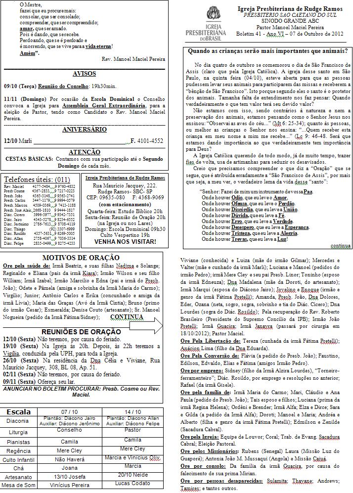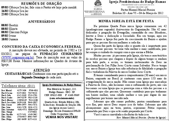 CEP: 09635-080 F: 011-4368-9069 (com estacionamento) Quarta-feira: Estudo Bíblico 20h Sexta-feira: Reunião de Oração 20h (na Igreja ou nos Lares) Domingo: Escola Dominical 09h30 Culto Vespertino 19h
