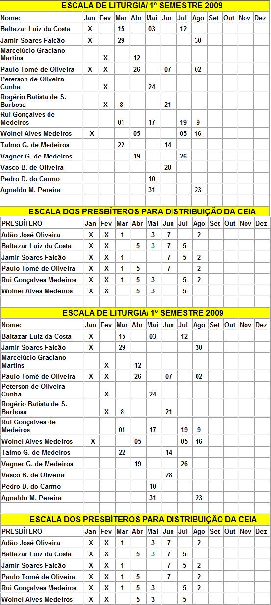 ESCALAS Nesta Semana Plantão : Presb. Wolnei Liturgia : Presb. Wolnei Diácono : Agnaldo/Peterson Som : Nilson C.Infantil 3-8 ------ Berçário , Estrelinhas , Cordeirinhos , Miss. do Rei : Classe única - - - Próxima Semana Diácono : David e Talmo Som : Nilson - - - LITURGIA DO CULTO ADORAÇÃO * Leitura - Salmo 50 * Hino 18 - Deus dos Antigos * Oração * Música - Robertha CONTRIÇÃO * Leitura - Romanos 6.1-14 * Oração Individual * Oração LOUVOR * Hino - 63 -As Muitas Bênçãos (Dízimos e Ofertas) * Leitura - II Co. 9.8-9 * Oração de Gratidão - Diác. Peterson * Cânticos - Equipe * Música - Robertha * Oração pelas crianças EDIFICAÇÃO * Leitura * Mensagem CONSAGRAÇÃO * Música - Marcos e família * Hino 164 - Nome Precioso * Oração e Bênção - - - Emérito: PASTORES Rev. Lee John Hi - 3287-0207 Efetivo: Rev. Israel D. Pereira 8454-1868 CONSELHO Adão José Oliveira Baltazar Luiz da Costa José Milton Figueiredo Paulo Tomé de Oliveira Rui Gonçalves Medeiro Sérgio Laércio Rocha Wolnei Alves Medeiros Eméritos: Jamir Soares Falcão Paulo Tomé de Oliveira JUNTA DIACONAL Agnaldo Matos Pereira David R. Rodrigues Petronílio S. da Cunha Peterson de O. Cunha Rogério B. S. Barbosa Talmo G. Medeiros Vagner G. Medeiros Vasco B. de Oliveira SOCIEDADES INTERNAS SAF - Luzia UMP - Cleisse UPA - Ana Claudia Dep.Infantil - Elvira CORAL - Presidente: Cida - Regente: Bel. Marcos ESCOLA DOMINICAL: Superint: Leide Vice: Marcelucio CONGREGAÇÕES APARECIDA DE GOIÂNIA Bel. Walmir Rufino da Silva Endereço: Av. Ipiranga, Qd 46, Lt 06, Casa 2, Setor Serra Dourada III, Aparecida de Goiânia – GO. SERRA AZUL Rev. Karley G. França 3 Endereço: Rua José B. Paiva, Qd. 1, Lt 5 Resid. Serra Azul. Goiânia/GO BURITI SERENO Rev. Rubens Costa Endereço: Rua da Graça, Qd. 128, Lt 17 - Aparecida de Goiânia/GO.