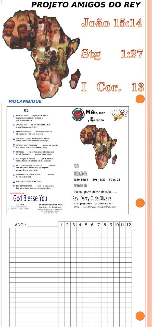 Em parceria com a JOCUM - Mozambique a viagem foi realizada nos meses de Março e Abril de 2011.via Johannesburg - South Africa. Chegando em Maputo fui recebido pelo o casal de missionários: Nilto e esposa Marlene Cavalheiro. logo de minha chegada fui apresentado á equipa da Jocum-Maputo.Com Nilto e Marlene visitei a primeira família mozanbicana ,de ali fomos visitar os irmãos da Igreja de refugiados os quais estavam 72 em consagração e jejum ficaram maravilhados por saberem que eu tinha 69 anos e que havia esperado 47 para ir a africa. Ministrei a palavra de Deus em um culto deles pastoreados pelo o pastor Jhon. Os irmãos Cavalheiro me hospedaram em sua casa,onde ocupei o quarto da Ana e Samy. O irmão Nilto e Marlene haviam confeccionado uma agenda para mim visitar os varios projetos e localidades em Maputo e varias provincias; centro,norte e sul do país. Em Machava;trabalhos comunitarios dos jocumeros.Com Paulo visitamos a aldeia de Matola Gare onde proporcionei o pagamento do primeiro mes de aluguel de uma casa para iniciar as atividades com jovens e adolecentes. Com Marcelo visitei a aldeia de Gobe onde com o Pr.Isaque fazem um traba lho com crianças. Viajei de onibus para a Provincia de Sofala-Em Beira fui recebido pelo o diretor de Jocum o Pr.Oliveira mozambicano que trabalha juntamente com outros obreiros no Orfanato escola,onde abrigam muitas crianças orfãs de pais mortos infectados com o HIV. De Beira viajei para Quelimane capital da Provincia de Zambezia.Fui re- cebido por Francisco e Carla responsaveis pela a Base de Quilimane.Visitamos a Ilha de Inhassunge atraves de balza porto utilizado para a saida dos negros levados à America por este lugar passou o nave gador portugues Vasco da gama.Na Ilha presenciei a instalação da bomba no poço perfurado pelos os obreiros de Quelimane-Nhassumge para proveer de agua saudavel aos moradores da aldeia.Alí trabalham como obreiros : o Pr.maquina e Justino.Projetos: feijão da Vovo e Carungo Milk.Necesitam de maie de transporte por exemplo uma bicicleta ou moto Em Quelimane falei na escola de capacitação de obreiros liderados pelo o jocumeiro TITO Participei da reunião de Obrerios dirigidos pelo Pr.Cleber e a biblioteca diri gido pela a irmã Debora.A ela prometi e ja enviei libros para apoia-la.Tivemos um dia de lazer junto ao Oceano Indico era um momento de confraternização dos missionarios.Foi muito gostoso,um lindo momento. De Quelimane viajei pra a provincia de Nampula para de ali viajar em avião para Lichinga provincia de Niassa.Me recebeu Victor Enumbo.Fui apresentado à equipa de lichinga onde o diretor e o irmao Diniz e Balbina almoçei com eles.Viajamos para a aldia de Itepela.Onde existe varios projetos: esporte-laboratorio-carpintaria-pecicultura entre outros.Pude abençoar algum financeiramente.Pastoreado pelo Pr.Pedro e Mis.Aldenice Nos acompanhou tio Jony e outros.Em Mitava visitei o trabalho dos jocumeros Silva e Guido cuidam de l6 idoas. Em Ntoto visitei com os obreiros Julio e Elidio onde trabalham discipulando os irmãos. Havendo visto e sentido a necesidade da obra nos lugares e projetos visitados em pleno voo nasceu no meu coração o Projeto Amigos do Rei SOS Mozambique .Tão logo chegeui ao meu lar em São Paulo,pus mão `a obra da Multinacional: A Igreja do Senhor Jesus aqui na terra.Logo busquei eDeus me concedeu e esta concedenco parceiros que sentiram o desejo de contribuir depois de saberem da realidade da Africa.estenderam os braços para juntamente comigo abraçarmos esse desafio. Queremos ser veradeiros amigos de Jesus fazendo o que Ele nos manda Jo.15:l4.Não somos religiosos mas tratamos de fazer o que diz Stg.1:27 e Paulo em I Cor.13: Queres trabalhar nesta Multinacional? Apresenta o teu Curriculum"Contribuição. THANK YOU CANIMBO GOD BLESSE YOU _ SIKWEMBO ACHIKUKATE KUECE = = = MISIÓN AMOR Y ESPERANZA