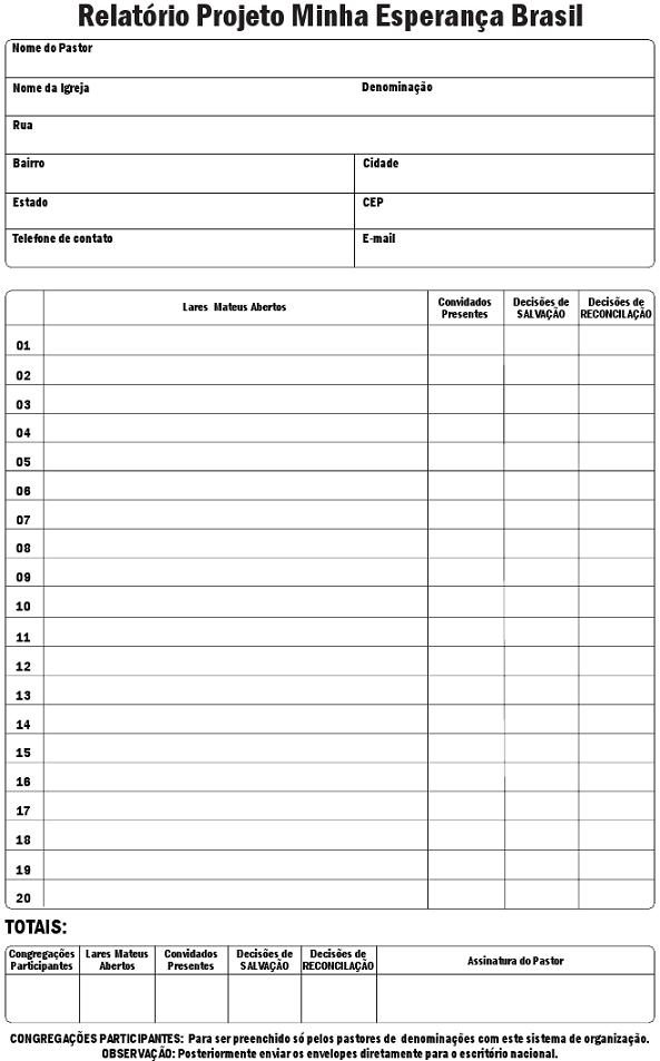 Tels: (21) 2426-9872 / 8797-4272 / 7821-5492 SIM! Eu vou ajudar na evangelização através de seu ministério e, para tornar isto possível, estarei: ( ) Evangelizando nos eventos do Projeto. Envie-me mais informações. ( ) Intercedendo por seu ministério e sustento. ( ) Contribuindo mensalmente com R$ ______________________. Estarei contribuindo através de: ( ) Cheque nominal e cruzado. ( ) Depósito bancário no Bradesco Agência 3262–0 C/C. 11738-2 • Toda remessa deve ser nominal a Wanderley Pinheiro Oliveira de Almeida Nome_____________________________________ Data nasctº.______________ Endereço__________________________________ Cidade _______________________________________ Estado_____ CEP_______________________ Email_________________________________________ Telefones____________________________ = = =