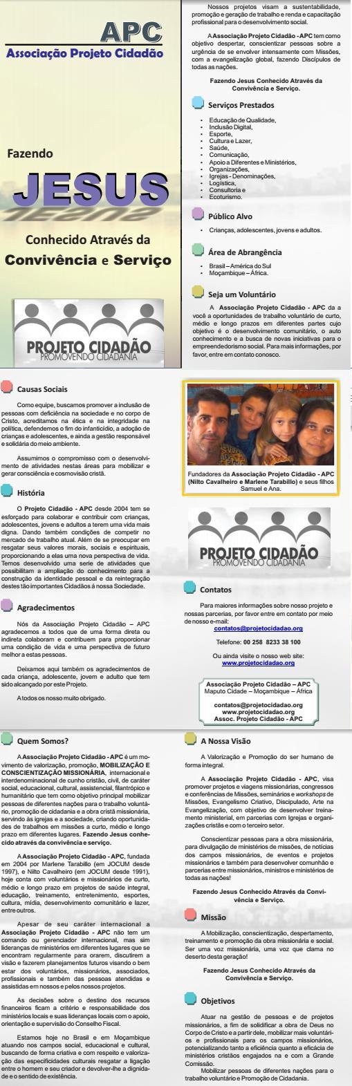 Valorização e Promoção do ser humano de forma integral A Associação Projeto Cidadão - APC, visa promover projetos e viagens missionárias, congressos e conferências de Missões, seminários e workshops de Missões, Evangelismo Criativo, Discipulado, Arte na Evangelização, com objetivo de desenvolver treinamento ministerial, em parcerias com Igrejas e organizações cristãs e com o terceiro setor. Conscientizar pessoas para a obra missionária, para divulgação de ministérios de missões, de notícias dos campos missionários, de eventos e projetos missionários e também para desenvolver comunhão e parcerias entre missionários, ministros e ministérios de todas as nações! Fazendo Jesus Conhecido Através da Convivência e Serviço.