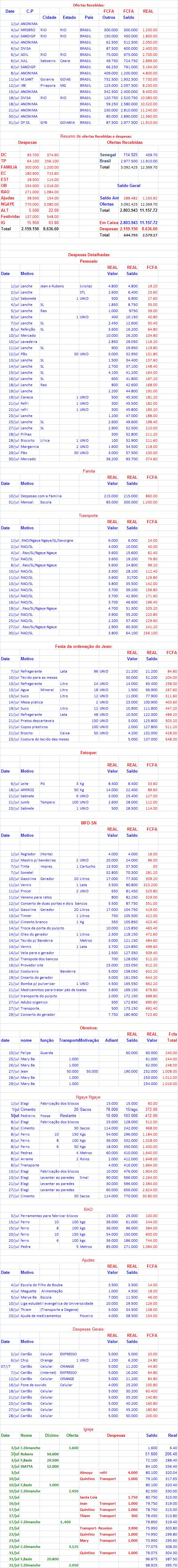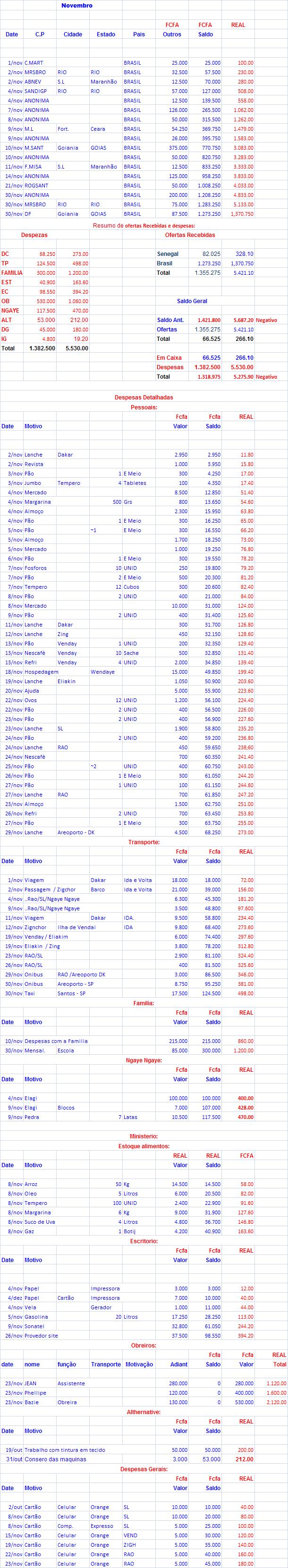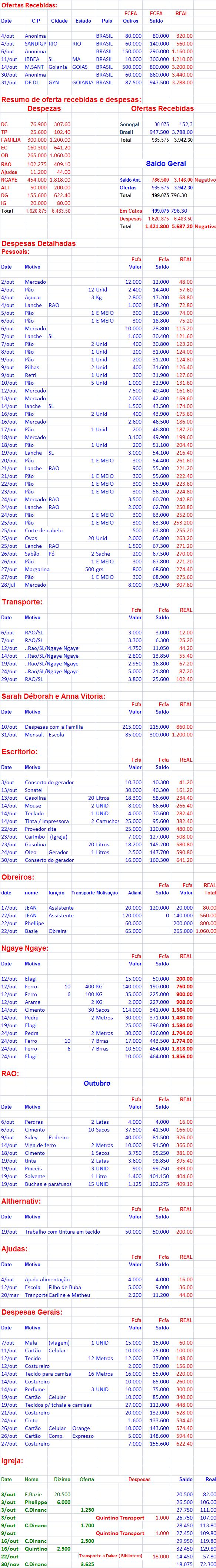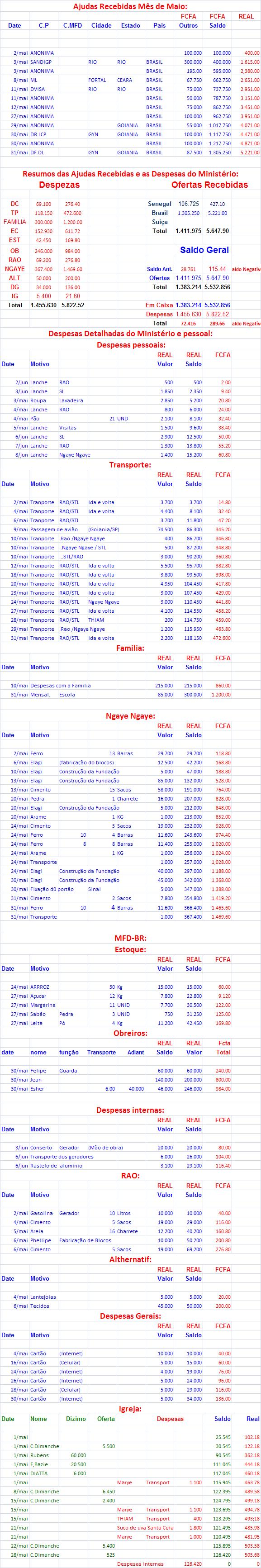 Rubens F. Silva 01/04/2011 Graça e Paz!!!! Aqui vai mais um relatório financeiro. Nele como sempre esta relacionado todas as ajudas recebidase no que usamos essas ajudas . Este mês que passou (Março) foi muito difícil para nós nos manter mos de pé, pois as ajudas que recebemos não cobriu a despesas internas. Com isso estamos no negativo 1.153,13 sem falar que até o dia 10 de Abril temos que conseguir 2.620,00 valor esse que será usado para pagar 20 cadeiras que compramos para a MFD-BR, despesas com uma obreira da MFD-BR, despesa com a minha duas filhas. Orem para que até o dia 10 venhamos saldar esses compromissos, orem também para que antes da minha saída eu consiga o dinheiro para comprar alguns materiais de bordado e costura para levar pra a escola de artesanato sem falar que preciso comprar algumas roupas pessoais e a minha passagem até S.Paulo (aeroporto de Guarulhos) Muito obrigado por vossas orações e apoio Rubens F.Silva Relação de ajudas recebidas: 10/05/2011 Meus amados aqui vão o relatório detalhado das ajudas recebidas no mês de Abril e também no que usamos essas ajudas. Peço aos amados que continuem orando a nosso favor, a exemplo pela conquista do novo carro ainda falta 36.600,00 (reais), pelas construções na base da missão em RAO e na construção de minha casa na aldeia de Ngaye Ngaye. Pelo crescimento do trabalho com as mulheres, a partir de Julho teremos uma pessoa a mais para manter, a pessoa será a esposa do irmão Jean. Ela passará ser obreira integral da missão, ore para que venhamos ter os recursos para manter a irmã. Esse mês para as contas forem pagas em dia temos que conseguir 10.000,00 reais Que o SENHOR os abençoe Rubens F.Silva Relação de ajudas recebidas:
