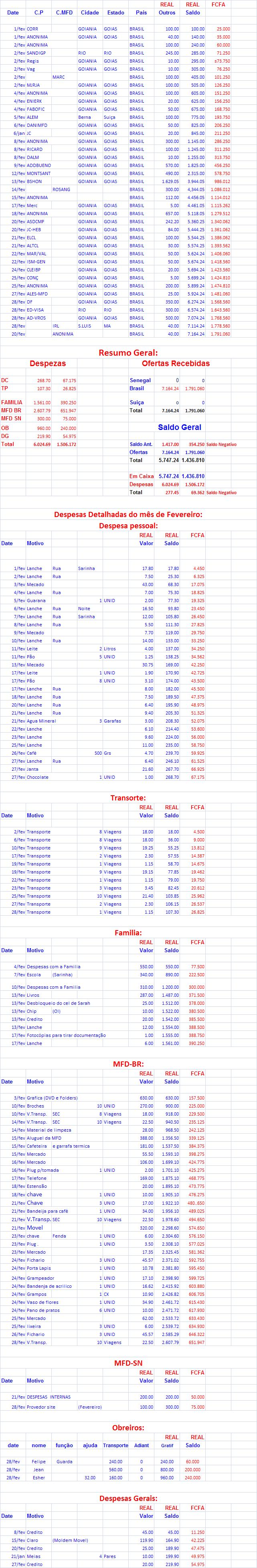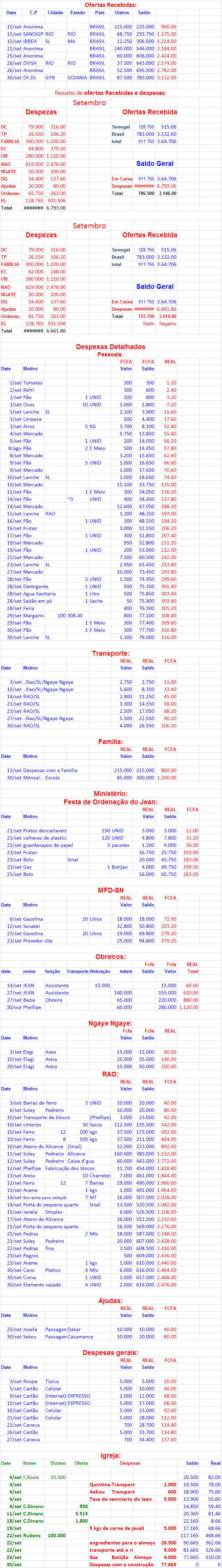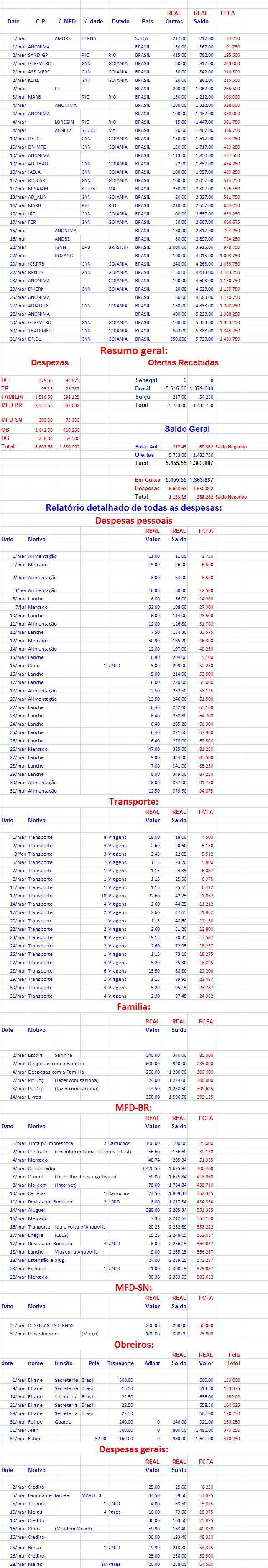 Rubens F. Silva 01/04/2011 Graça e Paz!!!! Aqui vai mais um relatório financeiro. Nele como sempre esta relacionado todas as ajudas recebidase no que usamos essas ajudas . Este mês que passou (Março) foi muito difícil para nós nos manter mos de pé, pois as ajudas que recebemos não cobriu a despesas internas. Com isso estamos no negativo 1.153,13 sem falar que até o dia 10 de Abril temos que conseguir 2.620,00 valor esse que será usado para pagar 20 cadeiras que compramos para a MFD-BR, despesas com uma obreira da MFD-BR, despesa com a minha duas filhas. Orem para que até o dia 10 venhamos saldar esses compromissos, orem também para que antes da minha saída eu consiga o dinheiro para comprar alguns materiais de bordado e costura para levar pra a escola de artesanato sem falar que preciso comprar algumas roupas pessoais e a minha passagem até S.Paulo (aeroporto de Guarulhos) Muito obrigado por vossas orações e apoio Rubens F.Silva Relação de ajudas recebidas: 10/05/2011 Meus amados aqui vão o relatório detalhado das ajudas recebidas no mês de Abril e também no que usamos essas ajudas. Peço aos amados que continuem orando a nosso favor, a exemplo pela conquista do novo carro ainda falta 36.600,00 (reais), pelas construções na base da missão em RAO e na construção de minha casa na aldeia de Ngaye Ngaye. Pelo crescimento do trabalho com as mulheres, a partir de Julho teremos uma pessoa a mais para manter, a pessoa será a esposa do irmão Jean. Ela passará ser obreira integral da missão, ore para que venhamos ter os recursos para manter a irmã. Esse mês para as contas forem pagas em dia temos que conseguir 10.000,00 reais Que o SENHOR os abençoe Rubens F.Silva Relação de ajudas recebidas:
